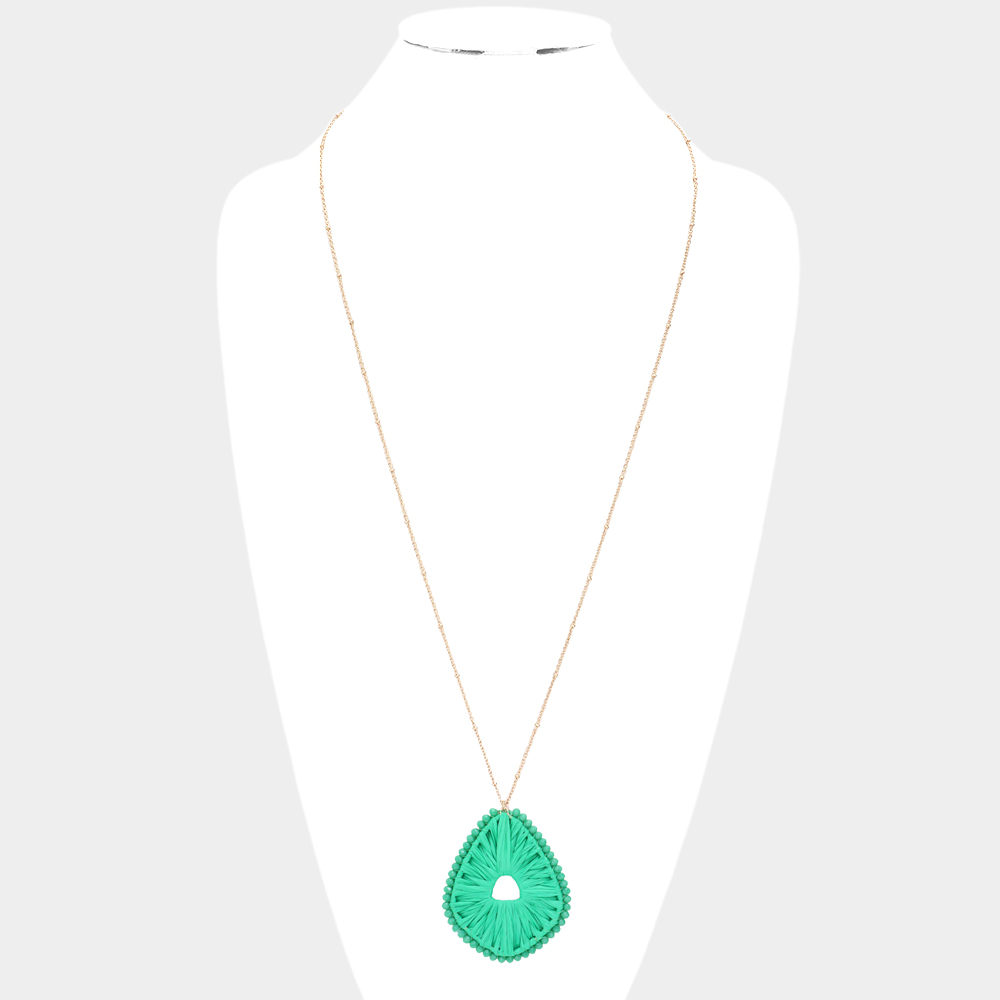 Faceted Bead Trimmed Woven Raffia Pendant Long Necklace