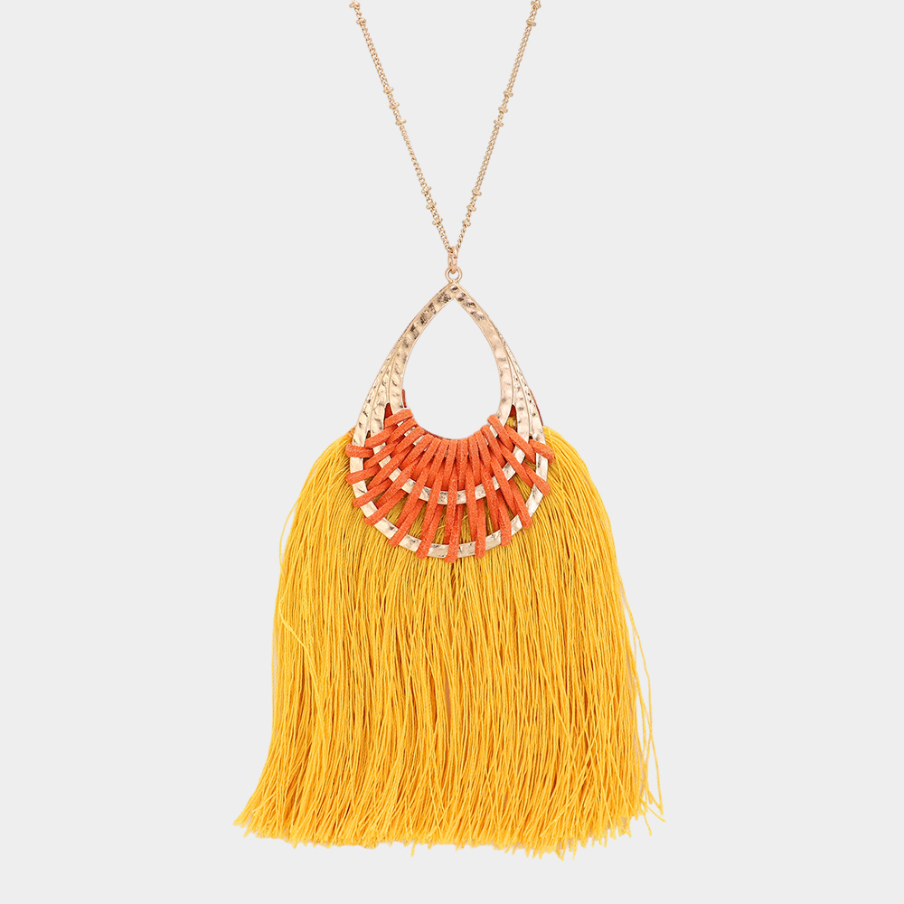 Fan Tassel Hammered Teardrop Pendant Long Necklace