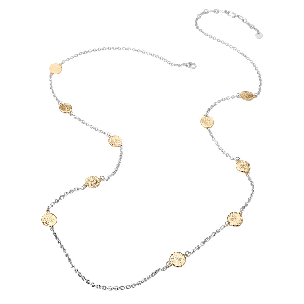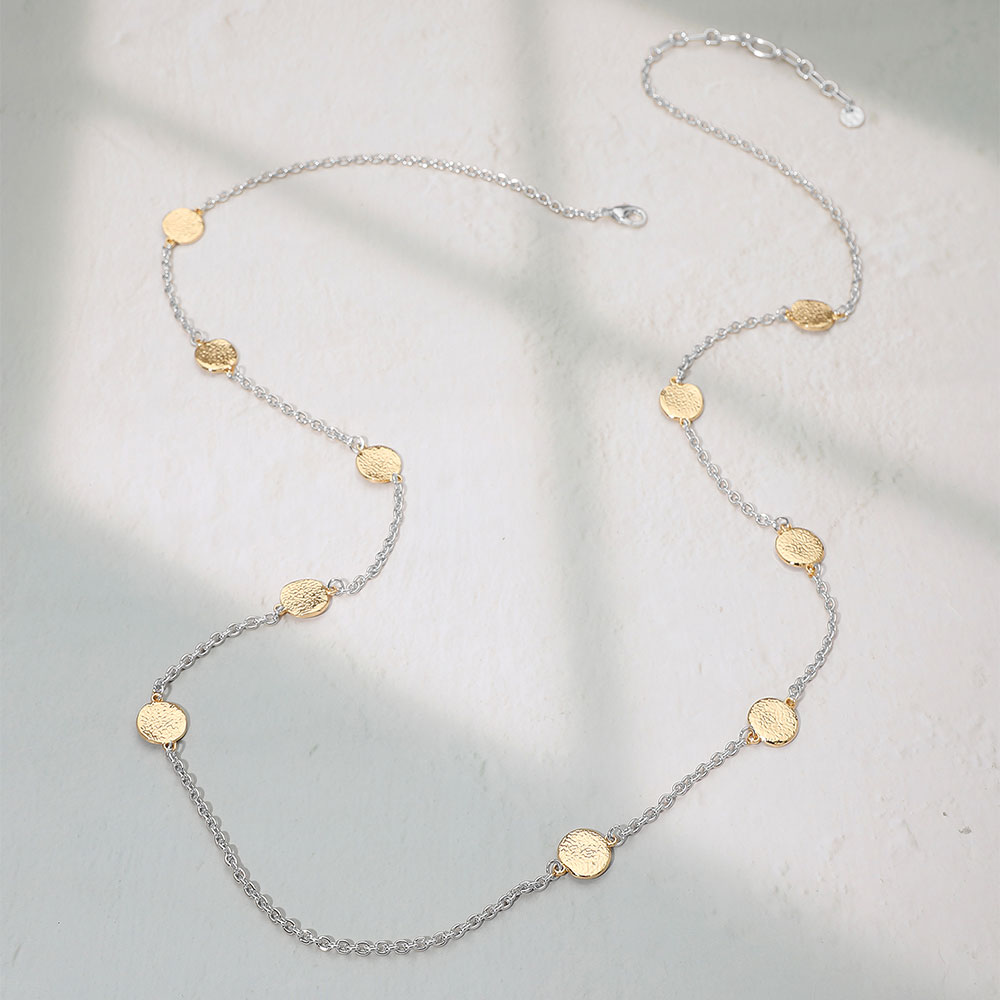 • Embrace effortless elegance with this long mixed coin accent chain necklace. Scattered textured charms add subtle movement and shine, making it a versatile layering piece that enhances both minimalist and statement looks while offering a refined, contemporary touch to any outfit.