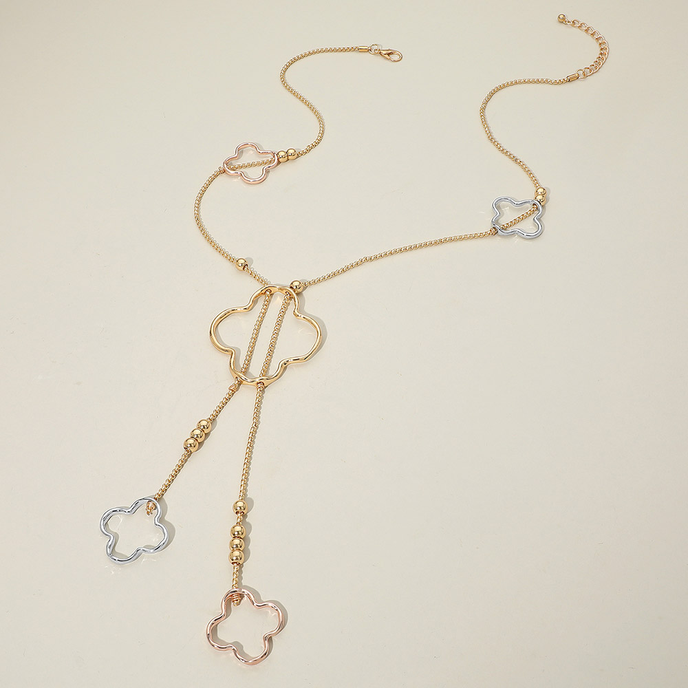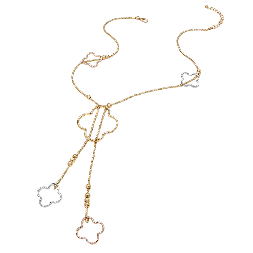 Details • Necklace Size : 33" + 2" L • Decor Size : 8.5" L • Add elegant detail to your look with this multi-tone clover pendant necklace, featuring a unique mix of metallic finishes and cascading drop accents. Delicate yet eye-catching, this necklace is perfect for layering or wearing solo as a refined everyday statement piece. • Lead and Nickel Compliant