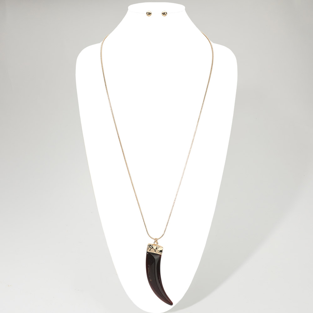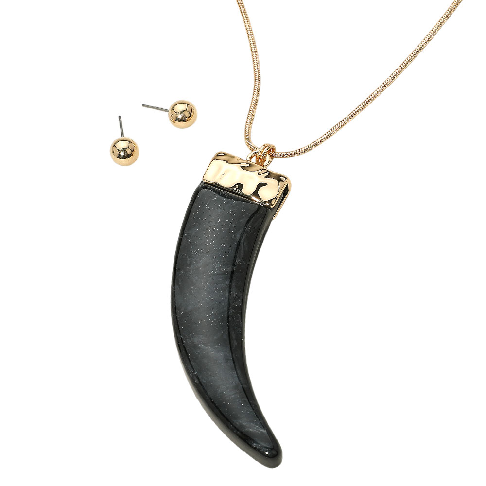 Details • Necklace Size : 33" + 3.5" L • Pendant Size : 0.8" X 3.5" • Earrings Size : 0.25" L • Sleek necklace featuring a horn-shaped pendant paired with simple stud earrings. A minimalist set perfect for adding a bold accent to everyday or evening wear. Versatile and stylish design. • Lead and Nickel Compliant