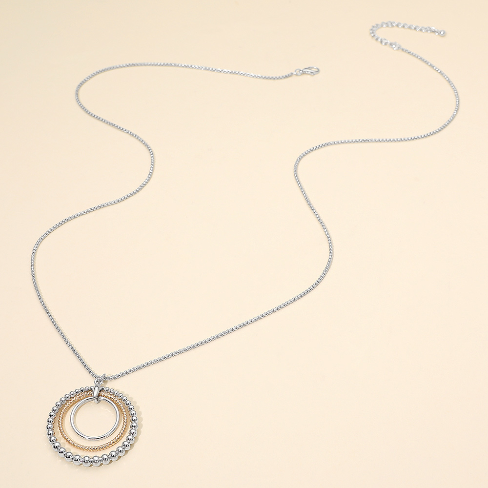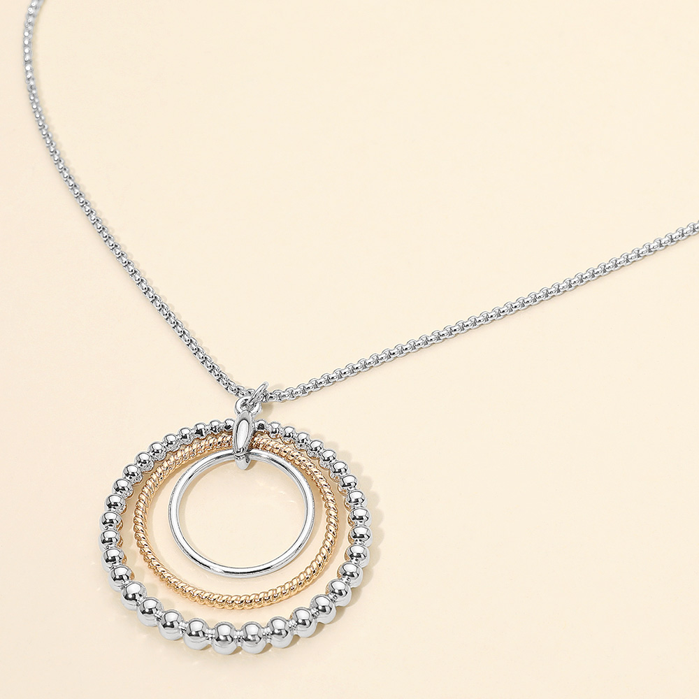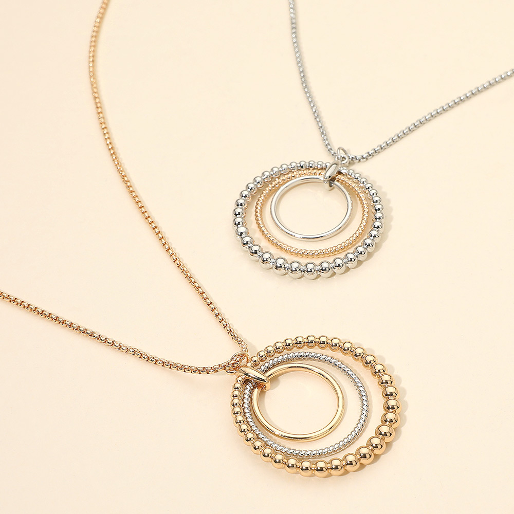 Details • Necklace Size : 34.5" + 3.5" L • Pendant Size : 1.7" X 1.75" • Features layered circular pendants with contrasting textures on a sleek chain for a modern, eye-catching look. Designed to add subtle movement and standout style to everyday outfits or dressier ensembles. • Lead and Nickel Compliant