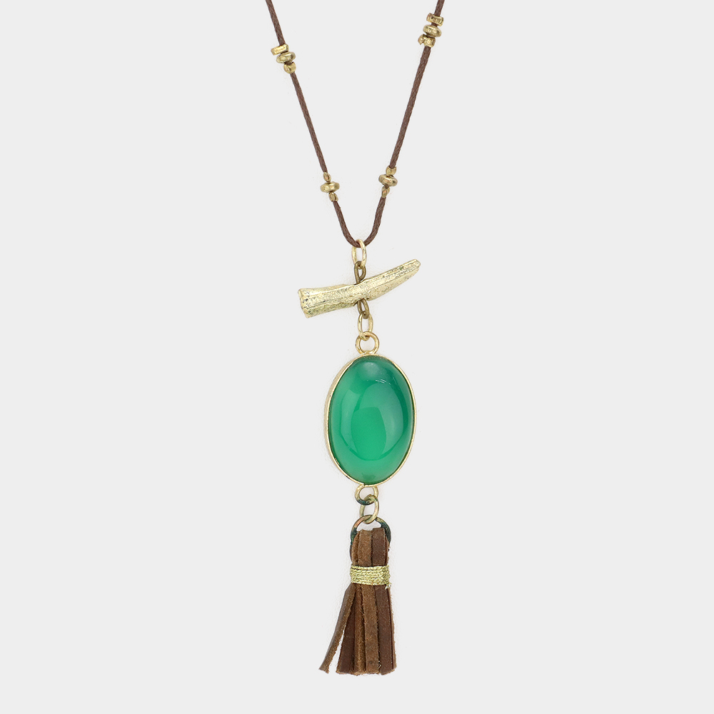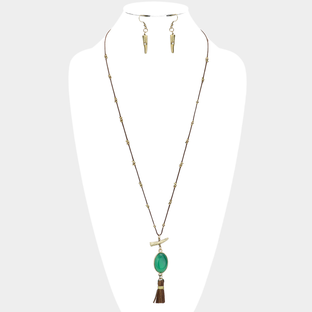 Oval Stone with Faux Leather Tassel Long Necklace
