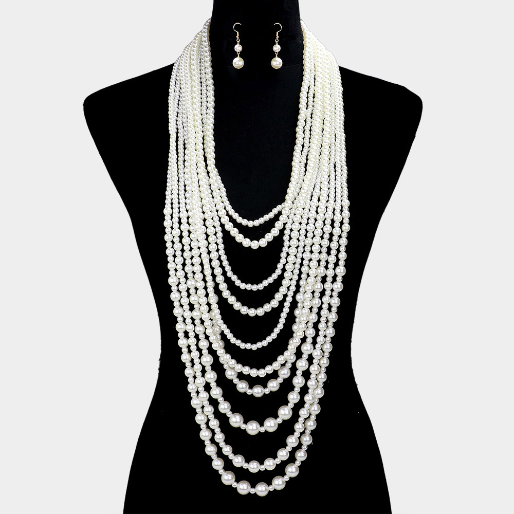 Details • Necklace Size : 48" + 3.25" L • Decor Size : 11.75" L • Earring Size : 1.75" L • Add timeless sophistication to your collection with this elegant multi-strand pearl necklace, complete with matching earrings. Featuring cascading layers for a graceful drape, this statement set is perfect for weddings, formal events, or adding classic glamour to any look. • Lead and Nickel Compliant
