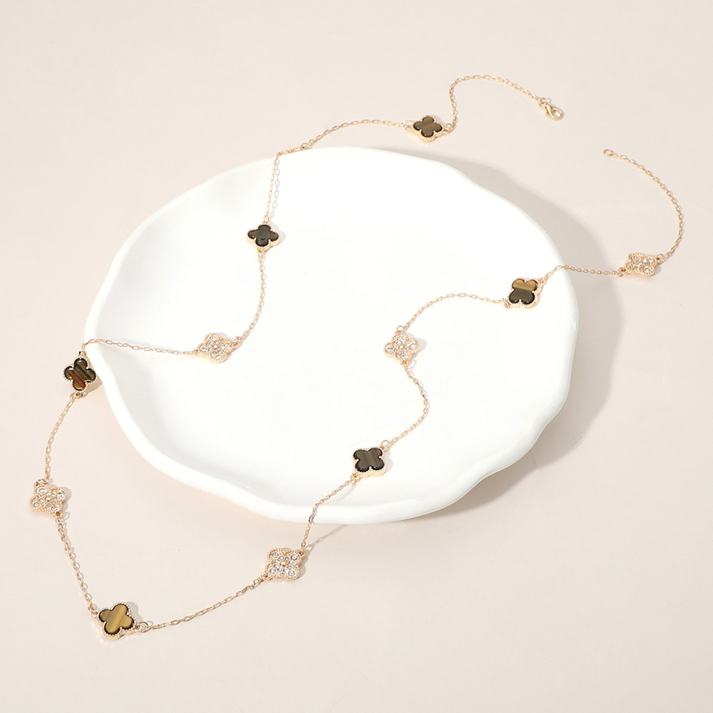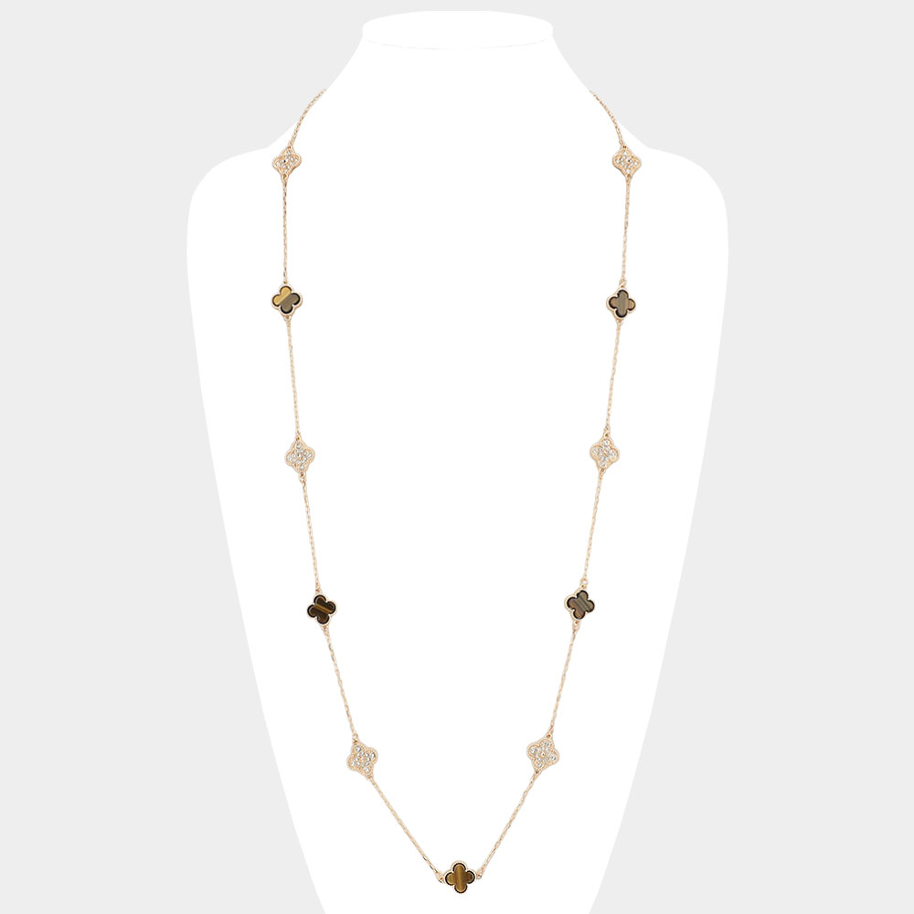 Details • Necklace Size : 34" + 3.25" L • Decor Size : 0.6" L • Chic and delicate necklace featuring quatrefoil-inspired pendants with shimmering accents. A perfect accessory for everyday elegance or refined occasions. Lightweight and timeless in design. • Lead and Nickel Compliant