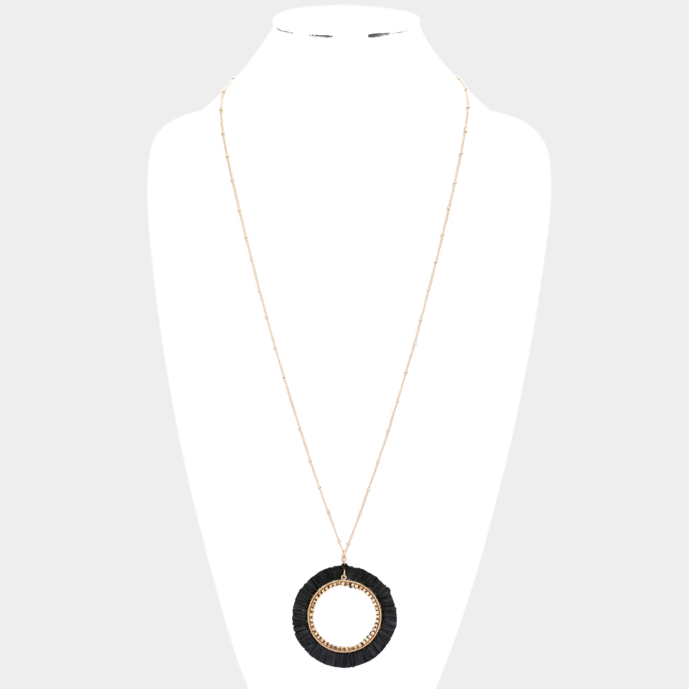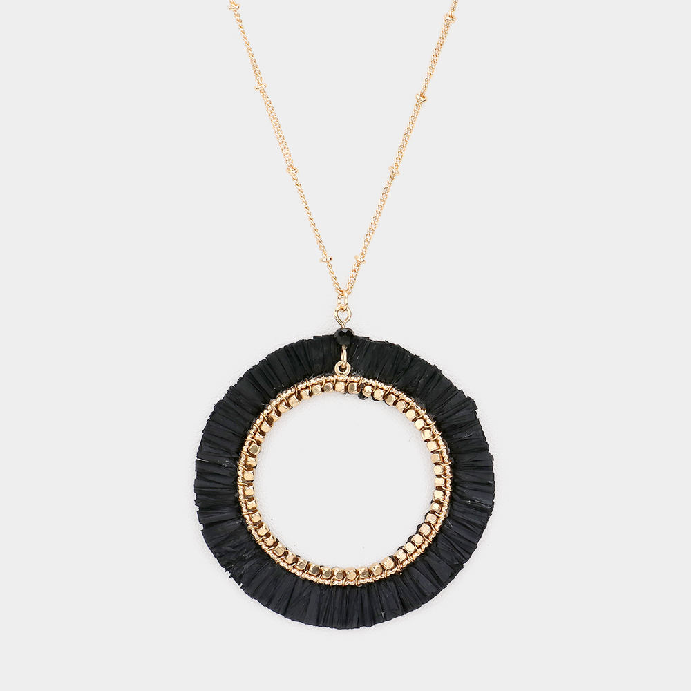 Raffia Trimmed Open Circle Pendant Long Necklace