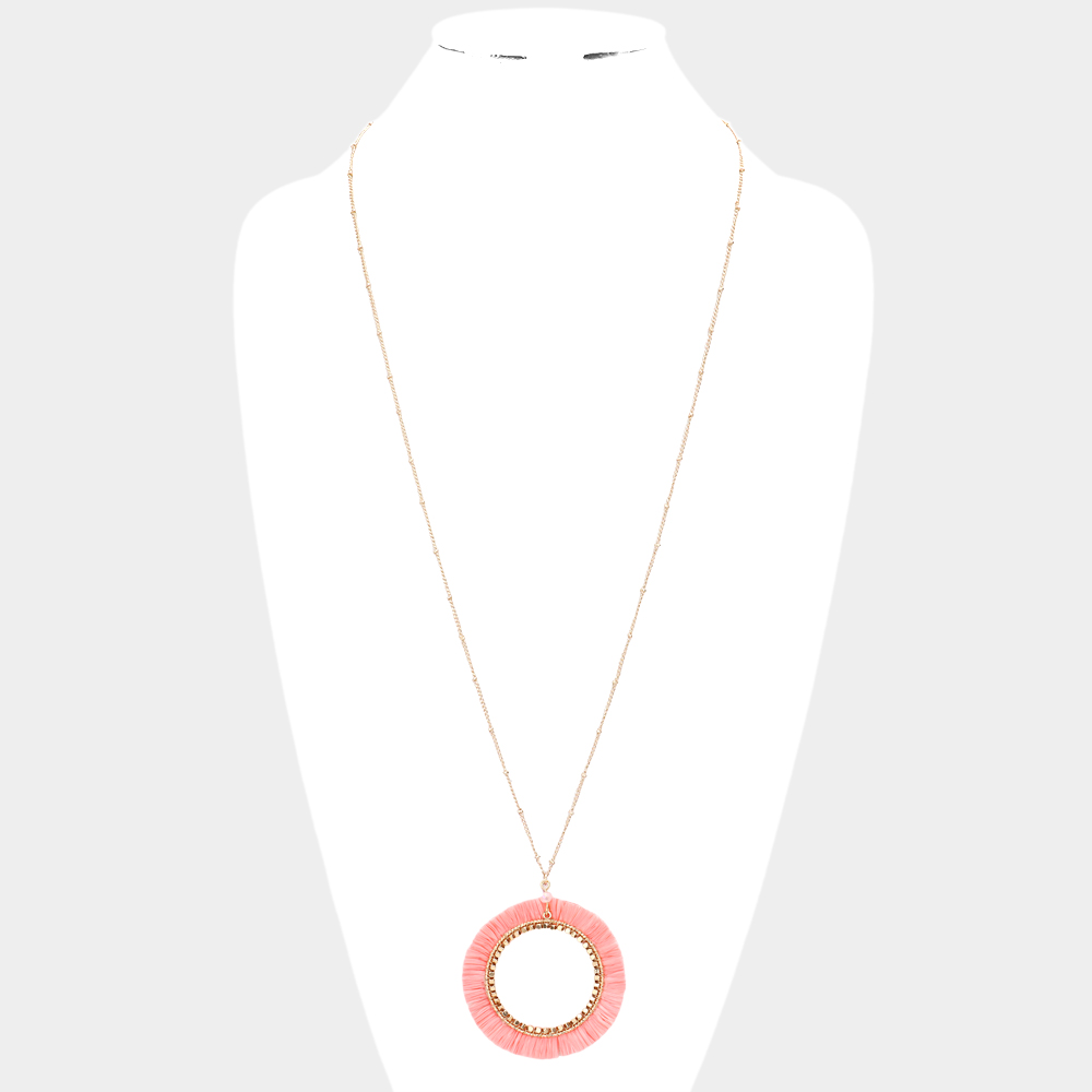 Raffia Trimmed Open Circle Pendant Long Necklace
