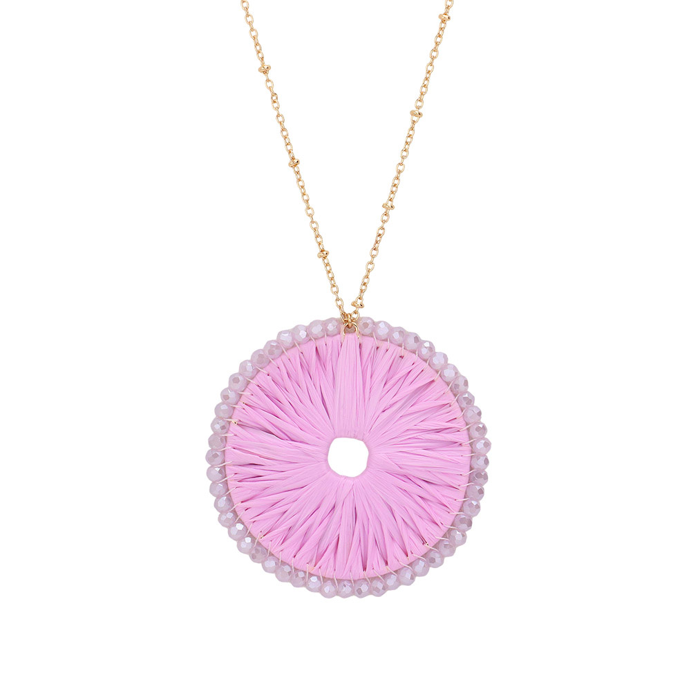 Round Raffia Faceted Bead Trimmed Pendant Long Necklace