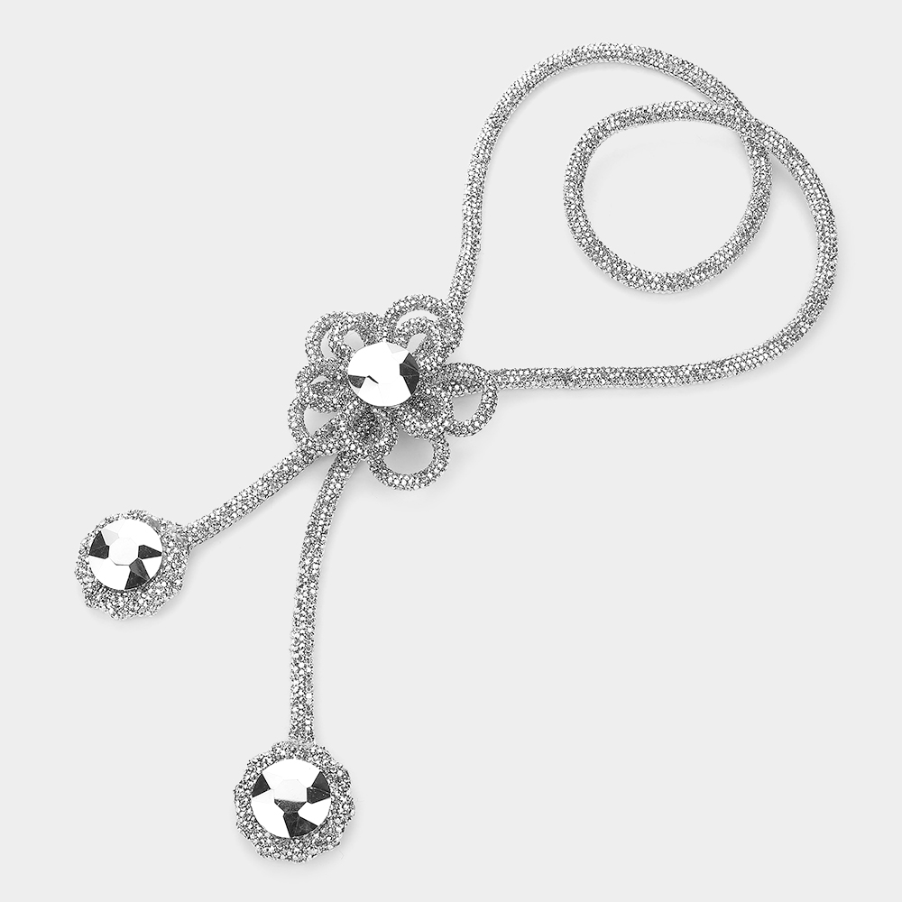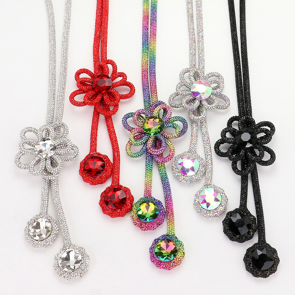 Round Stone Pointed Bling Studded Flower Pendant Long Necklace