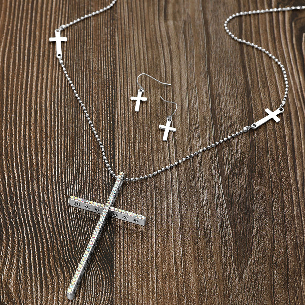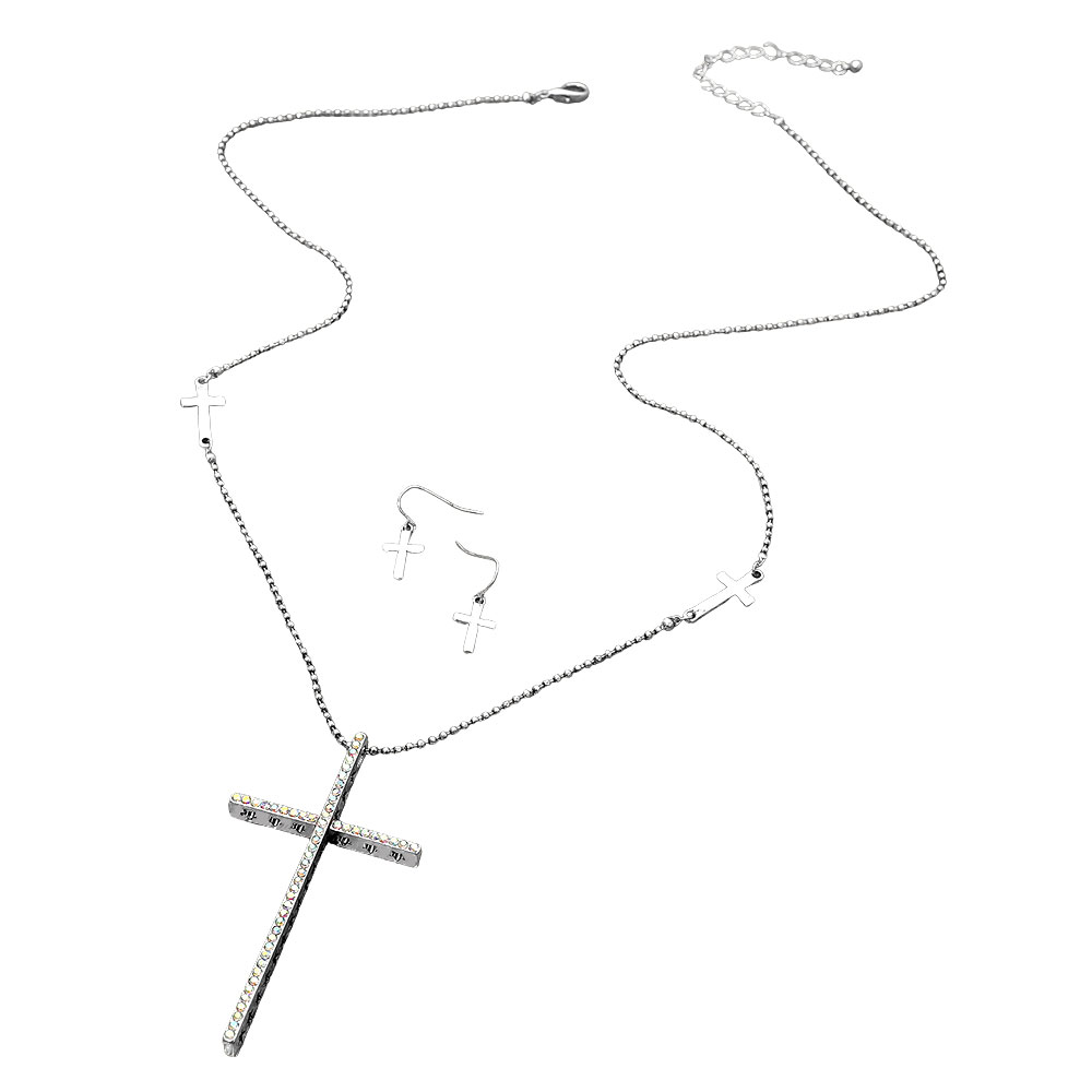 Details • Necklace Size : 29" + 3" L • Pendant Size : 1.75" X 3.25" • Earrings Size : 1" L • Minimalist necklace and earring set featuring cross pendants on a delicate chain, perfect for adding subtle meaning and style to everyday looks. This elegant set offers a refined touch, ideal for layering or wearing as a simple statement piece. • Lead and Nickel Compliant