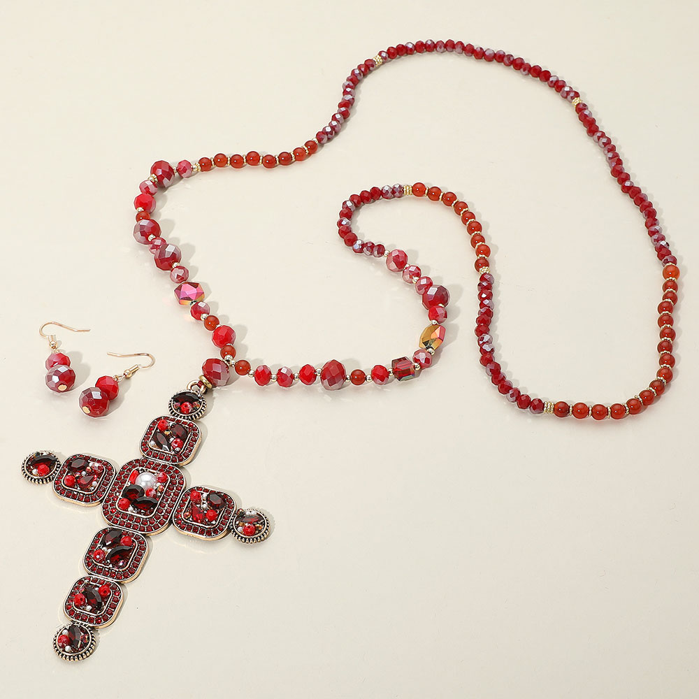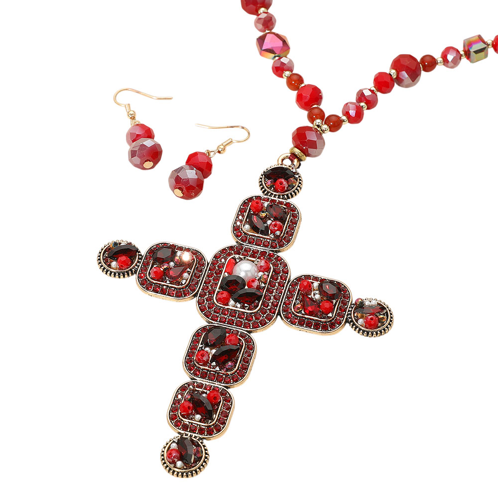 • Bold beaded necklace with an ornate cross pendant and matching drop earrings. A statement jewelry set perfect for adding dramatic flair to casual or dressy looks. Elegant and expressive design.