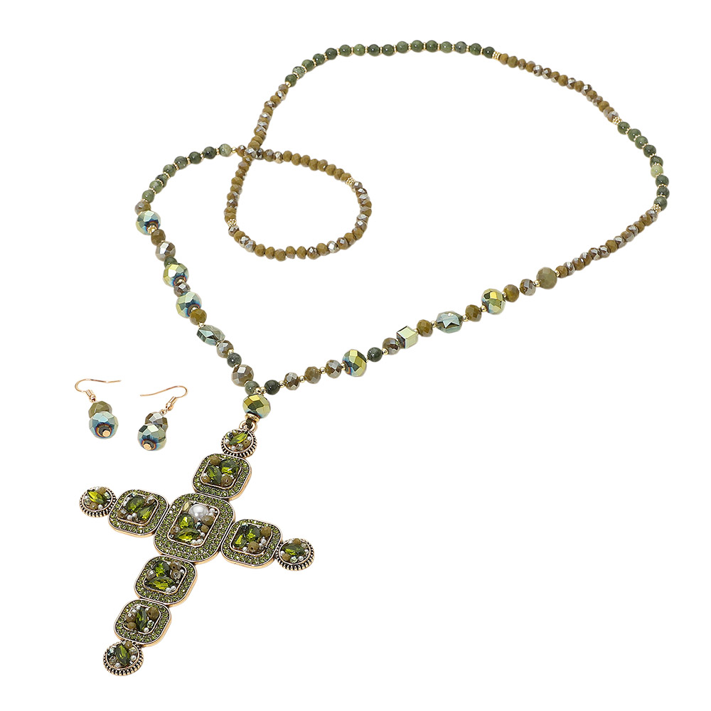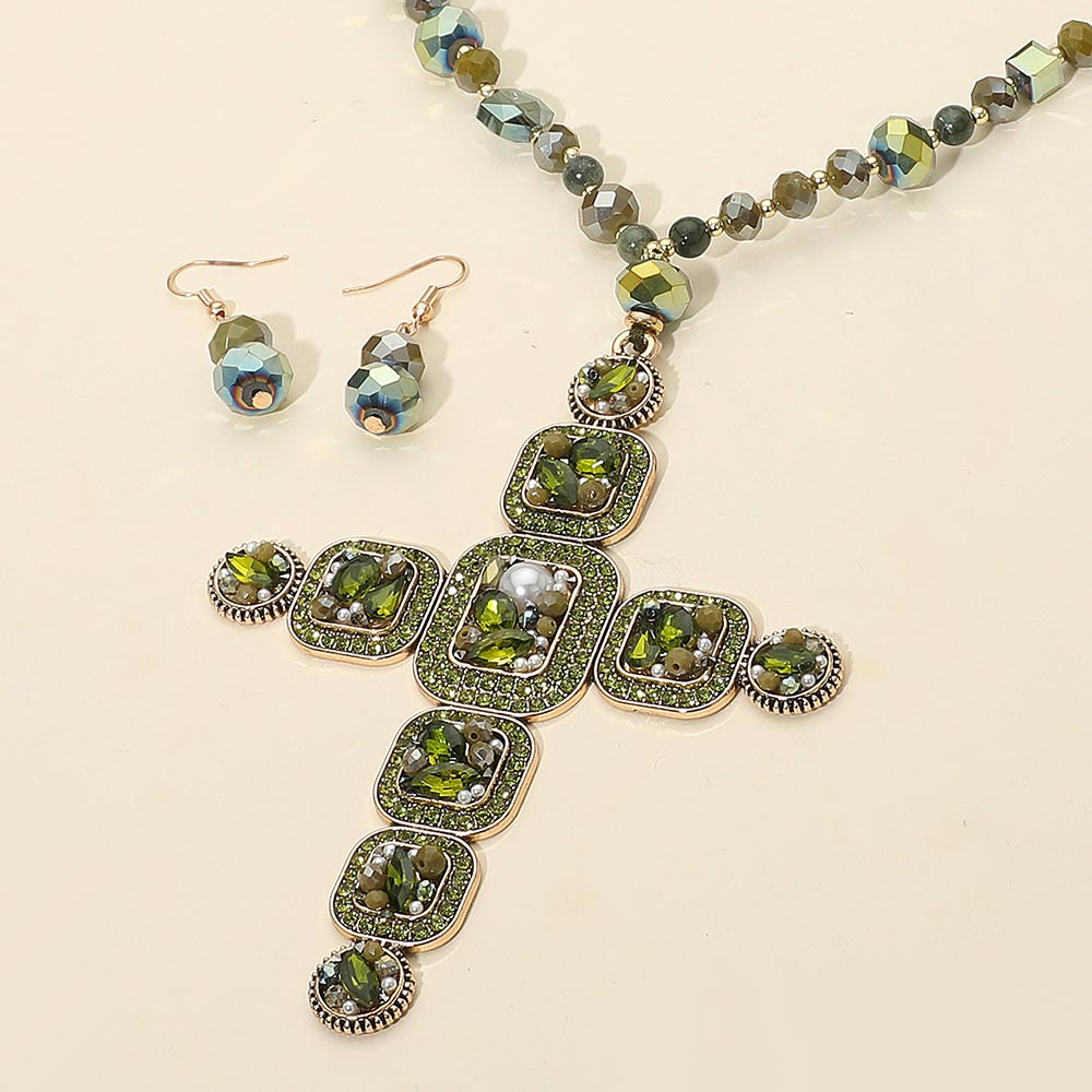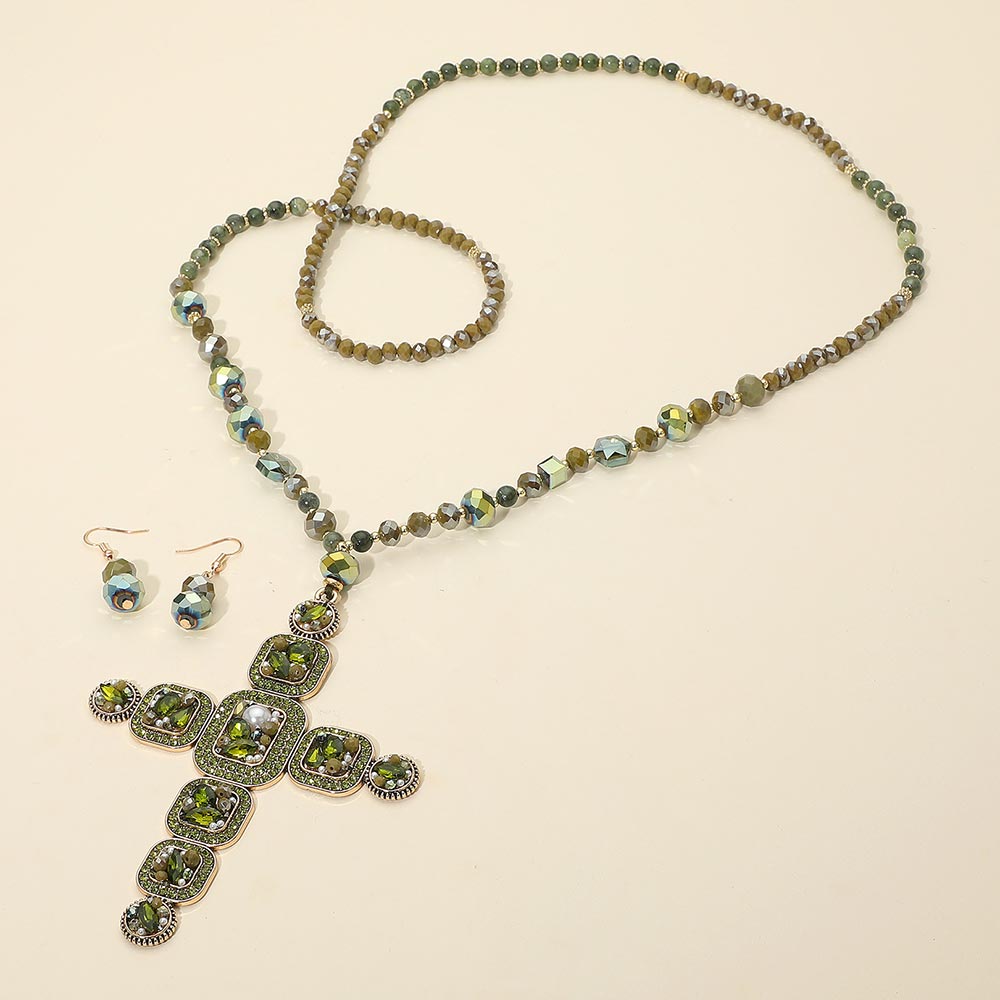 • Bold beaded necklace with an ornate cross pendant and matching drop earrings. A statement jewelry set perfect for adding dramatic flair to casual or dressy looks. Elegant and expressive design.