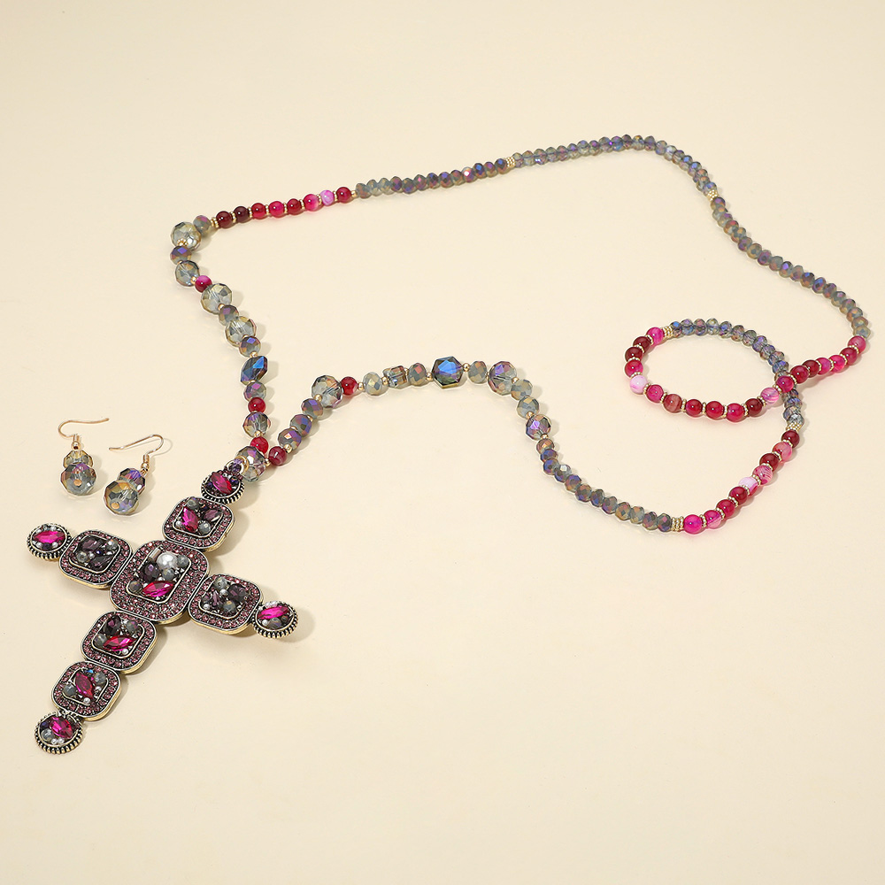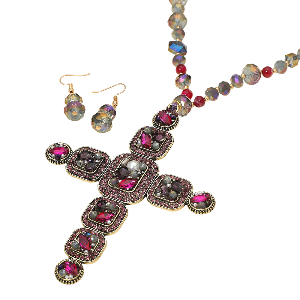 • Bold beaded necklace with an ornate cross pendant and matching drop earrings. A statement jewelry set perfect for adding dramatic flair to casual or dressy looks. Elegant and expressive design.