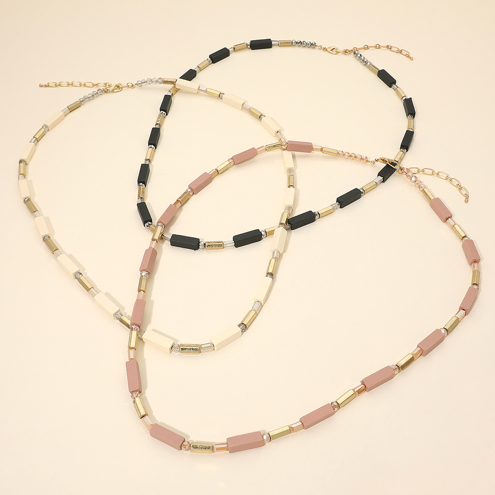 • Elevate your look with this structured wooden bead link necklace featuring alternating geometric accents and a sleek, minimalist profile. Designed for effortless layering or solo wear, it adds modern polish to everyday outfits and refined style for evening ensembles.