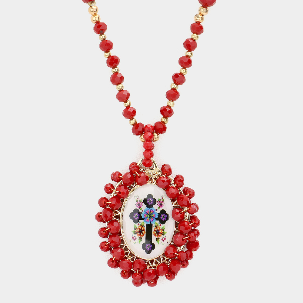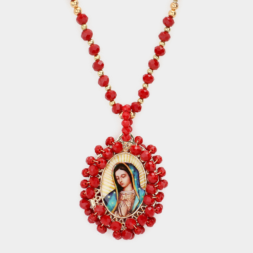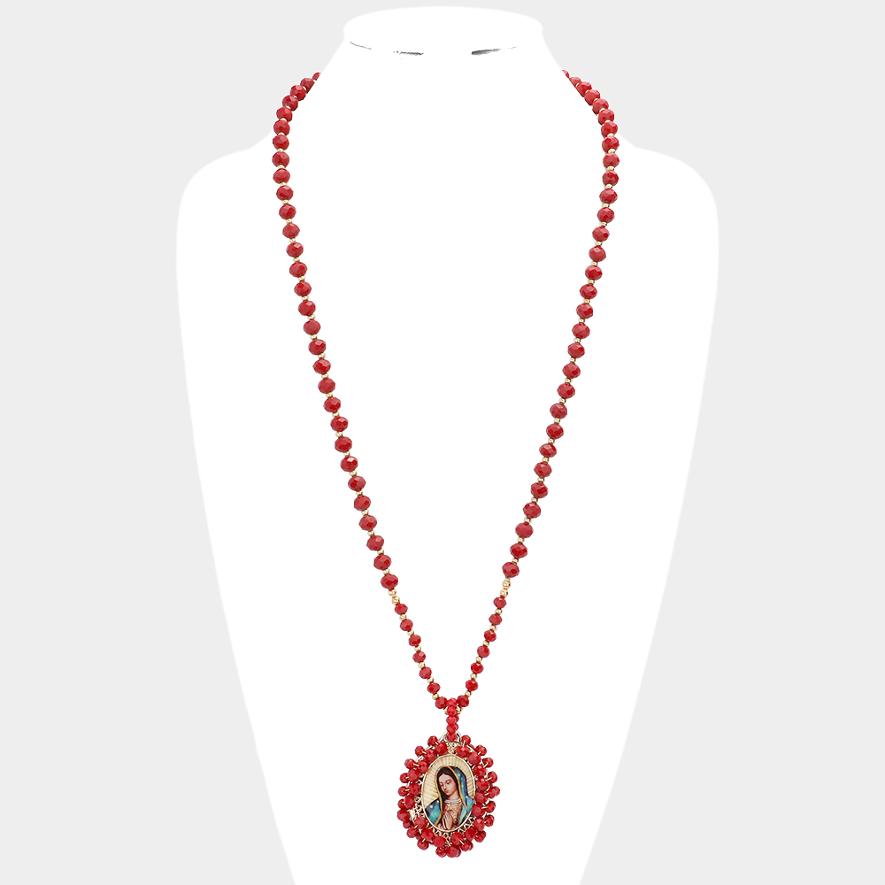 Virgin Mary Cross Printed Faceted Bead Cluster Pendant Long Necklace