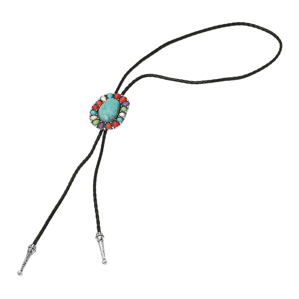 Details • Necklace Size : 46" L / Adjustable • Pendant Size : 2" X 2.6" • Striking Western-style lariat necklace featuring an oval turquoise pendant framed by teardrop stones and detailed silver accents. Hung on a braided cord with classic bolo tips, it’s the perfect blend of rustic charm and bold elegance. • Lead and Nickel Compliant
