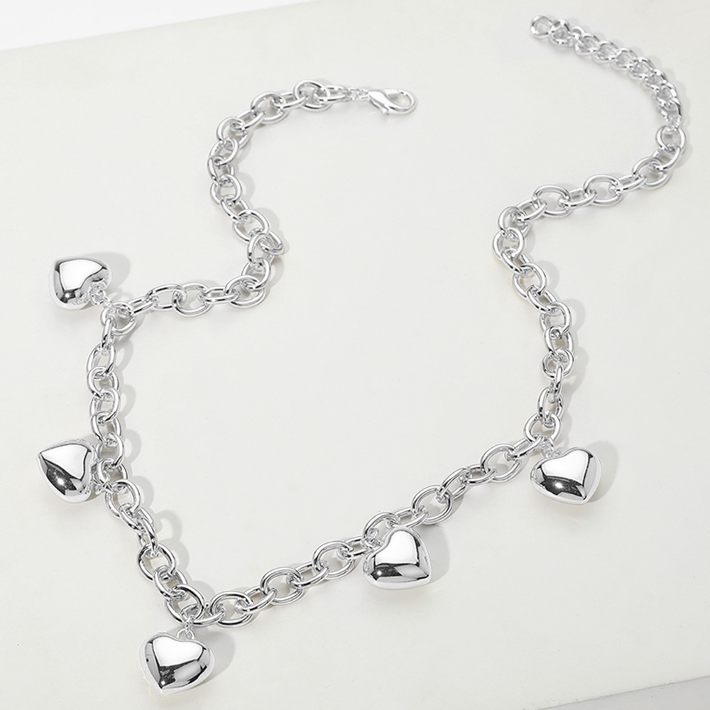Details • Necklace Size : 17" + 2" L • Decor Size : 0.75" L • Elegant chain necklace adorned with delicate heart charms. A romantic accessory perfect for layering or wearing solo to add charm and grace to your outfit. • Gold Dipped