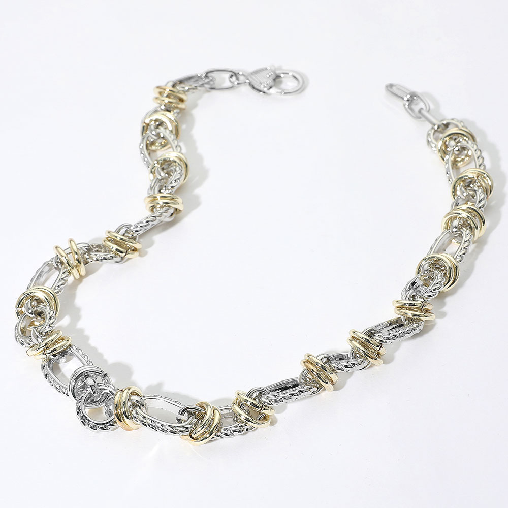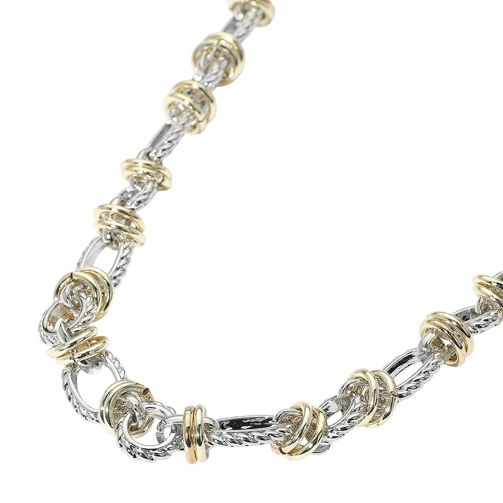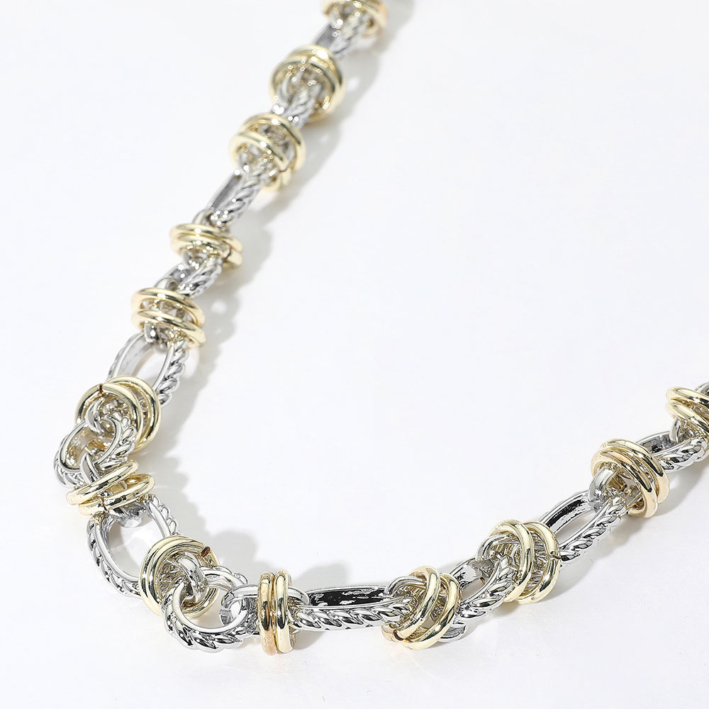 Details • Necklace Size : 17.5" + 1.25" L • Decor Size : 0.5" L • Stylish necklace featuring a series of twisted rope-like links interspersed with circular knot accents. A bold and structured design perfect for statement wear or elegant layering. • Gold Dipped