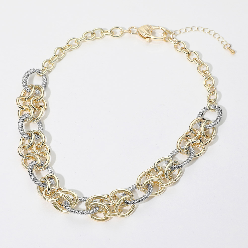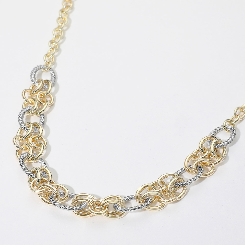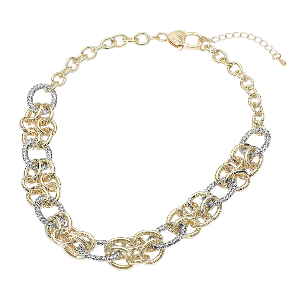 Details • Necklace Size : 16.5" + 2" L • Decor Size : 0.75" L • Bold statement necklace featuring thick textured links and rope-style details. Perfect for adding a dramatic accent to any outfit, from casual looks to elevated evening ensembles. • Gold Dipped