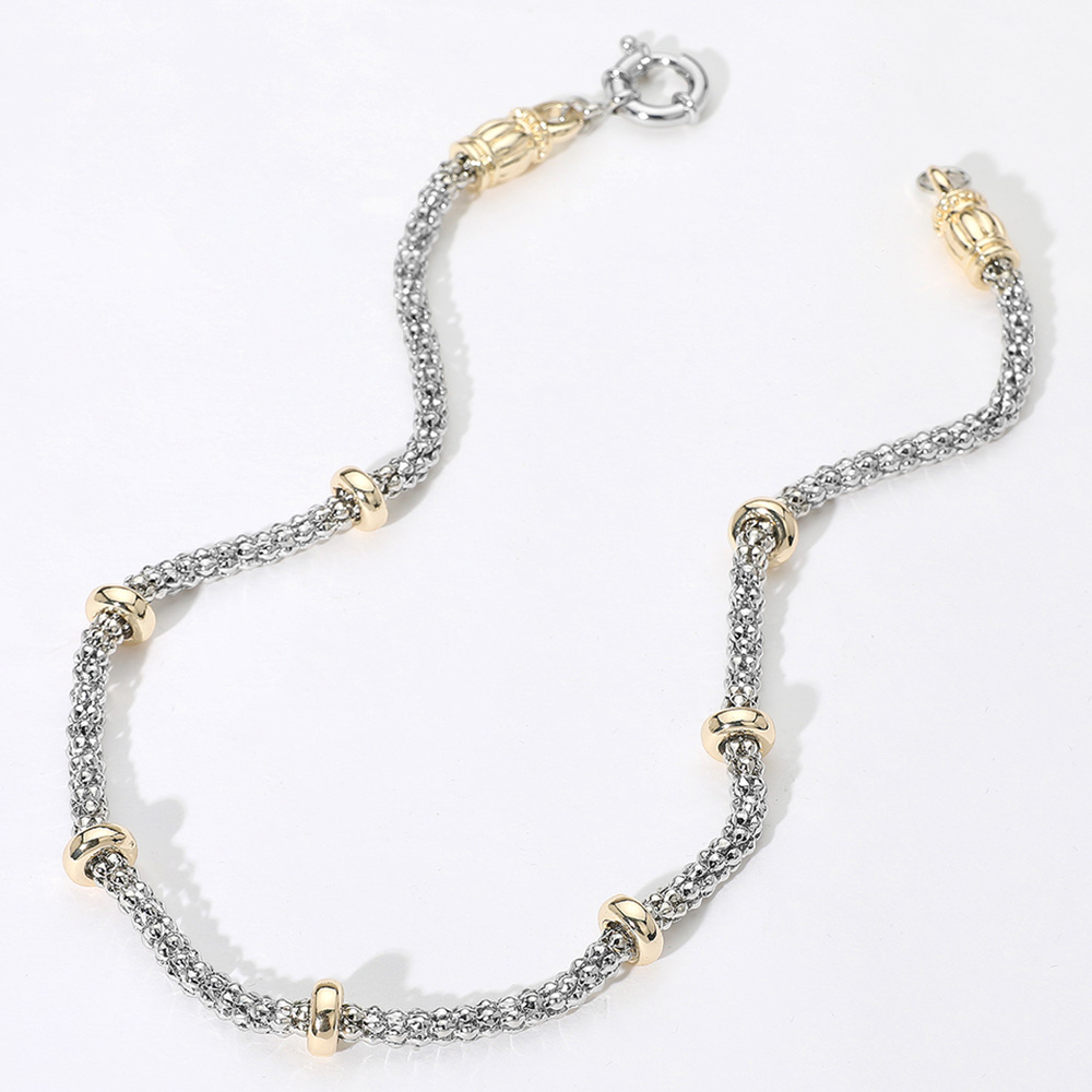 Details • Necklace Size : 18.5" + 0.25" L • Decor Size : 0.4" L • Elegant necklace featuring a textured chain design adorned with smooth accent rings. The two-tone finish adds visual interest, making it a versatile accessory that transitions effortlessly from casual to formal occasions. • Gold Dipped