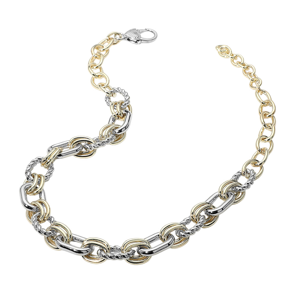 Details • Necklace Size : 17" + 2" L • Decor Size : 0.5" L • Stylish and versatile, this dual-tone mixed link chain necklace blends polished and twisted links for a unique, textured look. The secure clasp ensures comfortable wear, making it perfect for layering or as a statement piece to elevate both casual and dressy outfits. • Gold Dipped