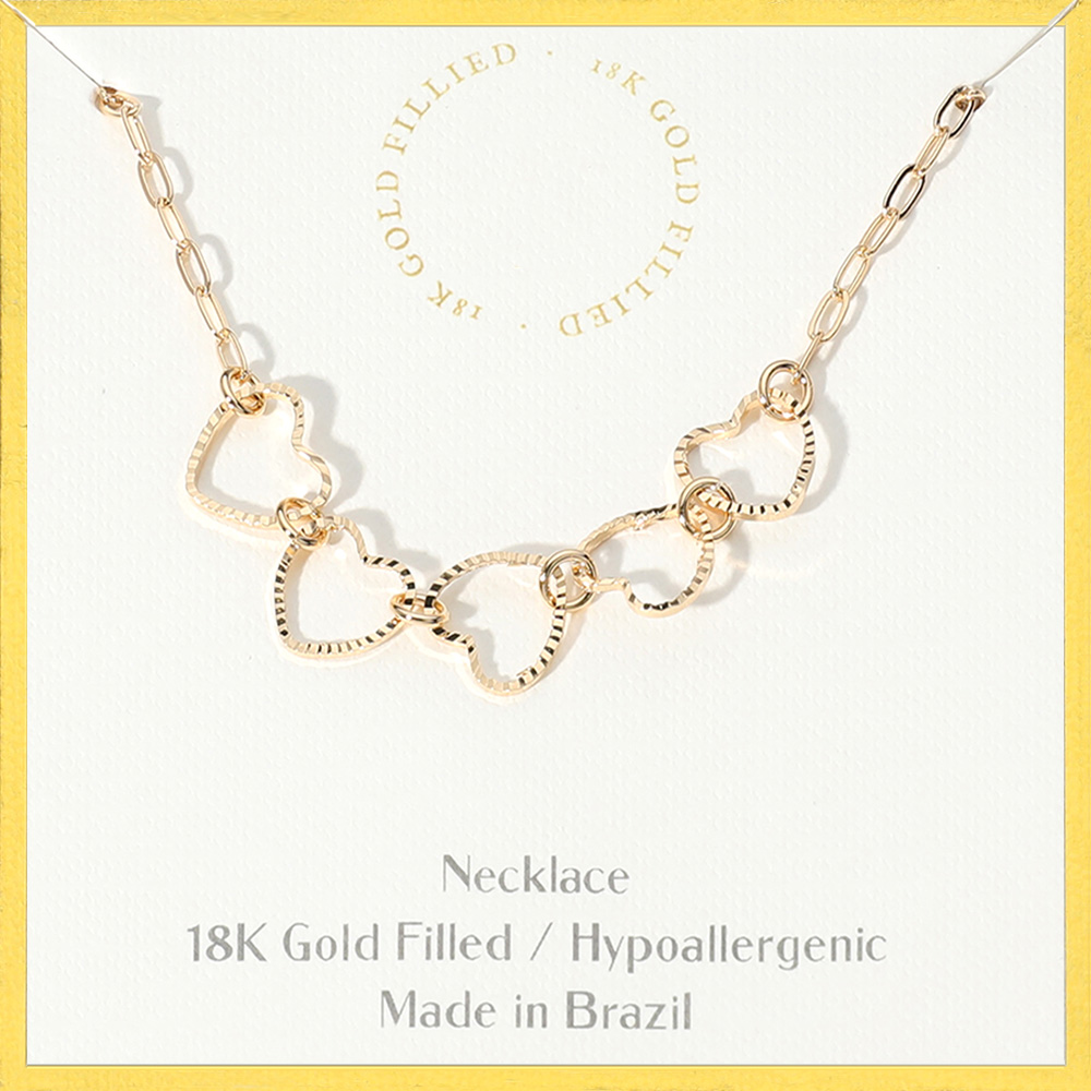 Details • Necklace Size : 19" + 2.25" L • Decor Size : 2" X 0.4" • Water resistant and tarnish free • Charming necklace featuring open heart links on a delicate chain. A romantic and stylish piece that brings playful elegance to everyday wear or makes a thoughtful gift for someone special. • Lead and Nickel Compliant • Hypoallergenic • Gold Filled • Made In Brazil