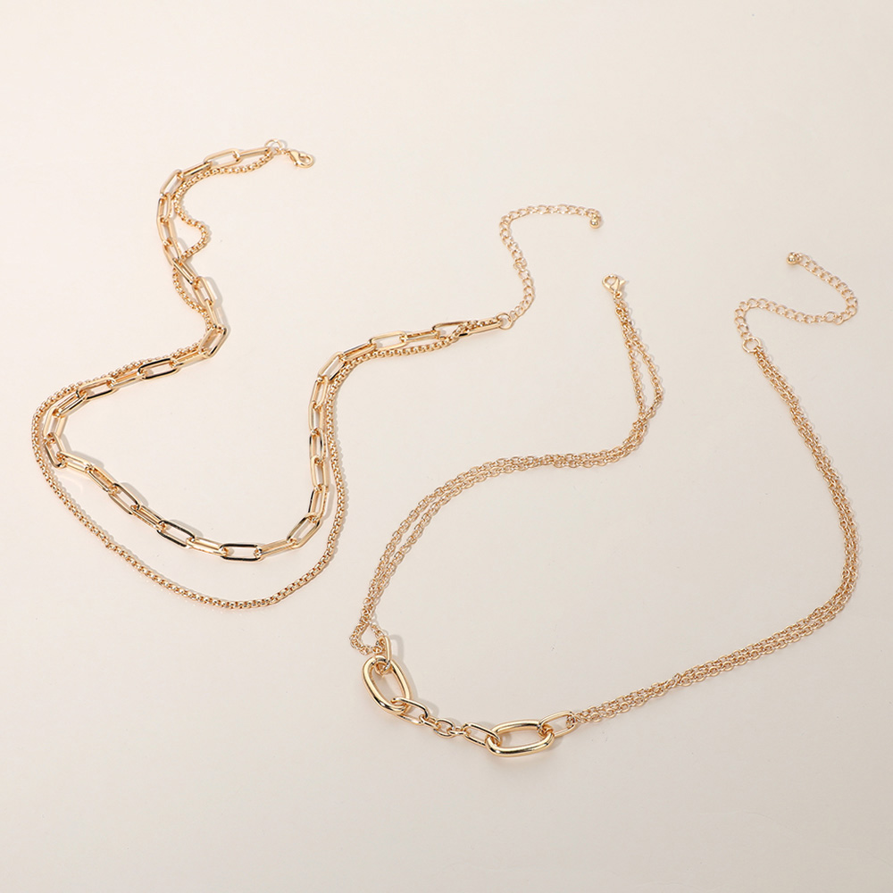 Details • Necklace 1 Size : 15.5" + 3.25" L, 0.75" L • Necklace 2 Size : 17" + 3.25" L, 0.4" L • Stylish layered chain necklace featuring mixed link designs for a bold yet elegant look. The multi-strand style adds texture and dimension, making it perfect for enhancing any casual or formal outfit with a touch of modern sophistication and effortless charm. • Lead and Nickel Compliant