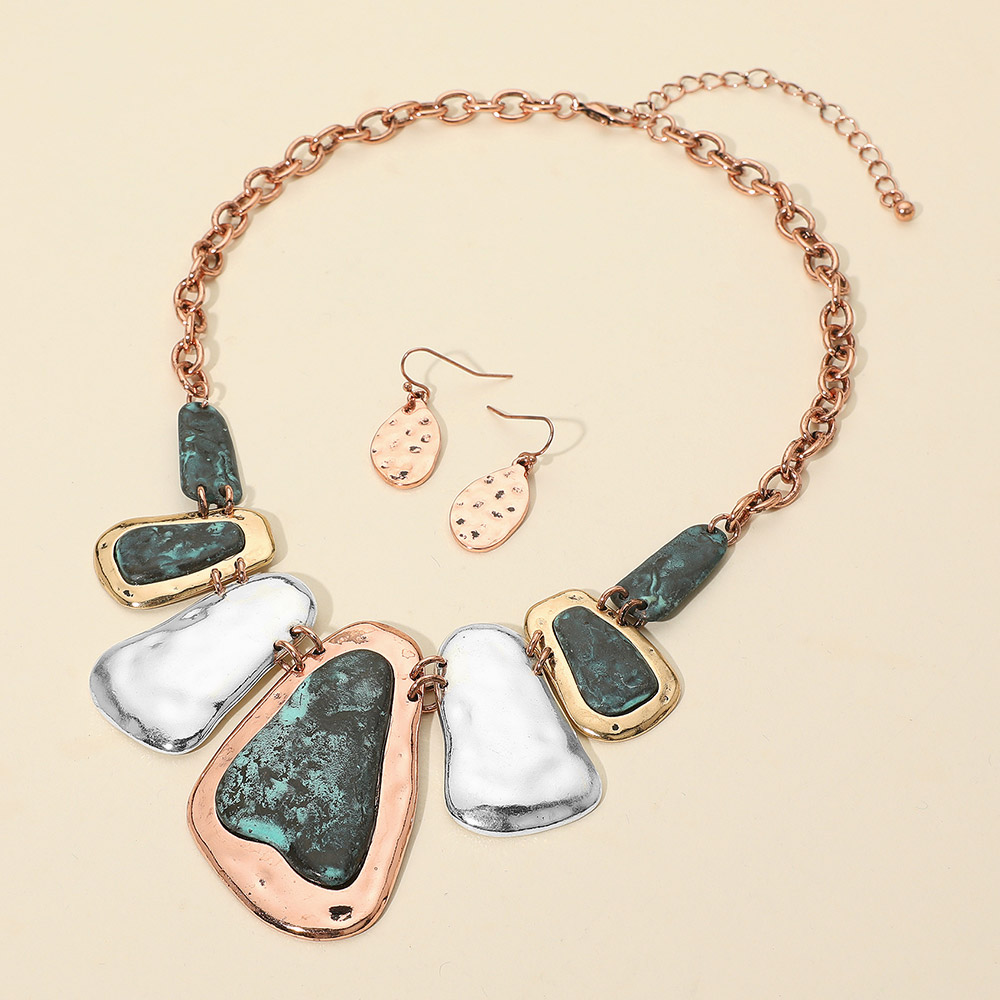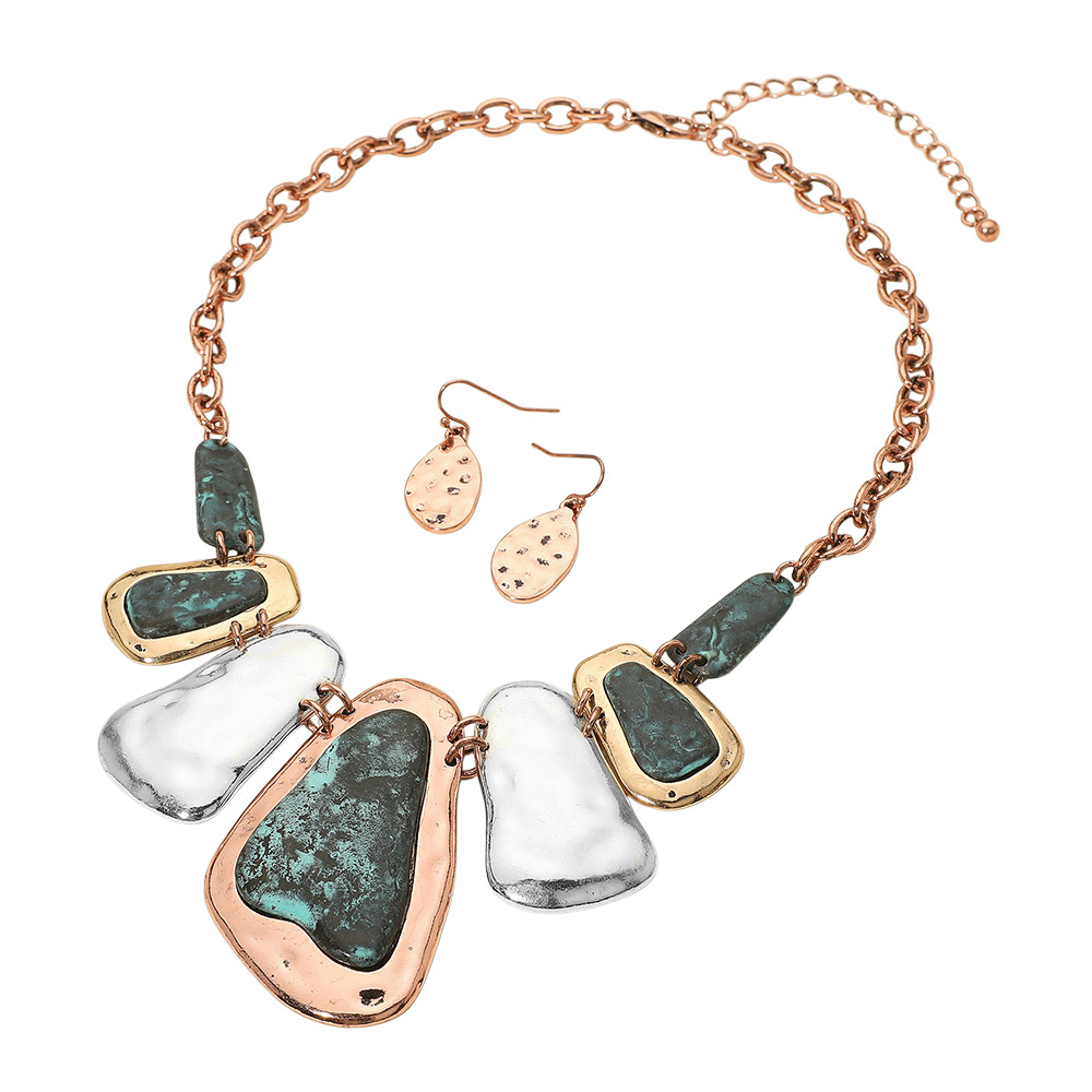 Details • Necklace Size : 17" + 3" L • Decor Size : 2.5" L • Earrings Size : 1.25" L • Modern necklace and earring set featuring abstract hammered pendants in mixed tones. A bold accessory perfect for adding artistic flair to both casual and dressy outfits. Adjustable chain for comfort. • Lead and Nickel Compliant