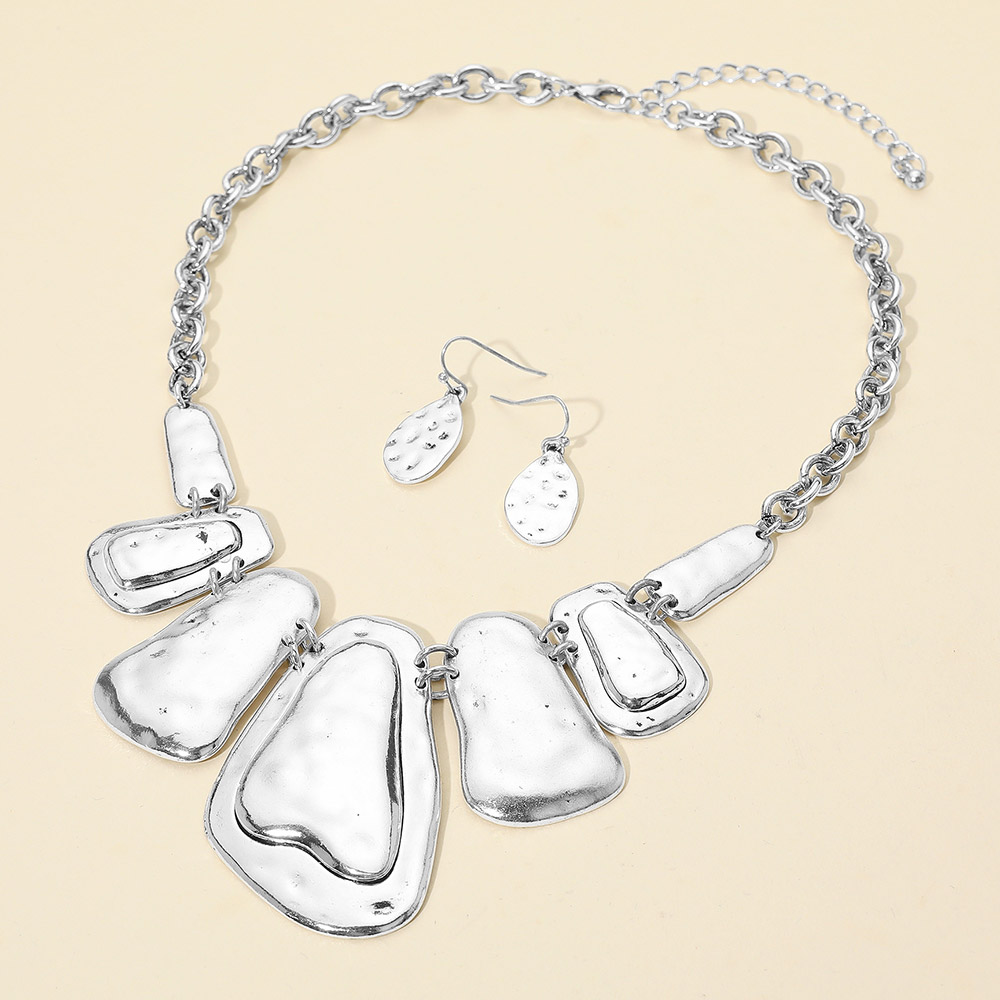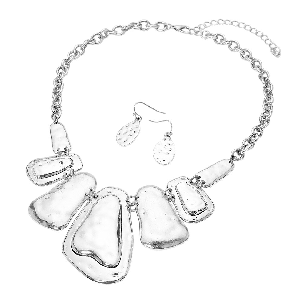 Details • Necklace Size : 17" + 3" L • Decor Size : 2.5" L • Earrings Size : 1.25" L • Modern necklace and earring set featuring abstract hammered pendants in mixed tones. A bold accessory perfect for adding artistic flair to both casual and dressy outfits. Adjustable chain for comfort. • Lead and Nickel Compliant