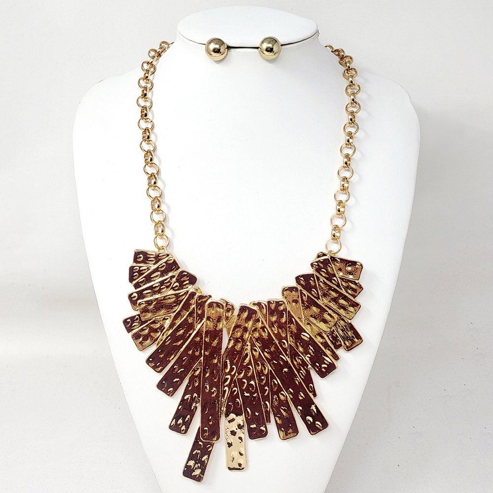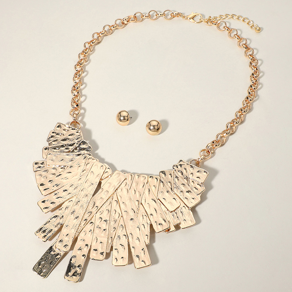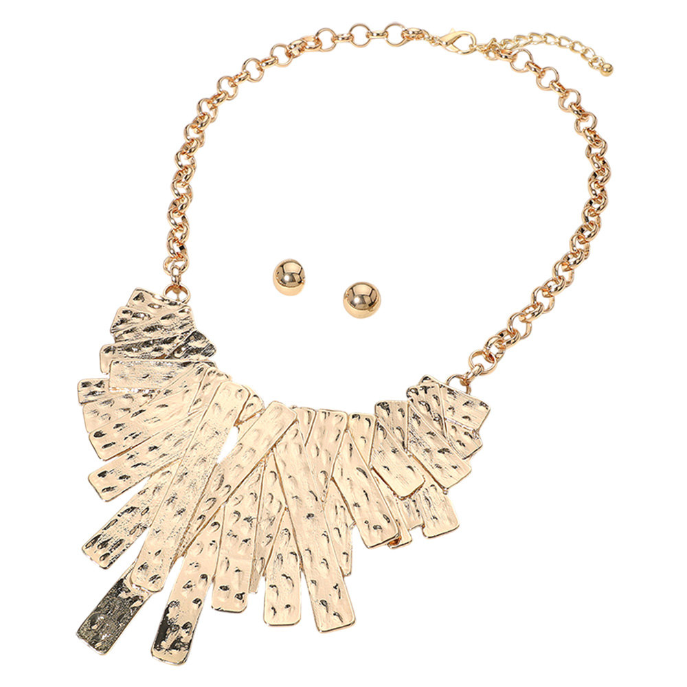 Details • Necklace Size : 26.5" + 3.25" L • Decor Size : 4.25" L • Earrings Size : 0.6" L • Elevate your look with this hammered metal statement necklace and matching stud earrings. Featuring textured fringe-style accents on a bold chain, this versatile set adds modern sophistication and shine. Perfect for special events or enhancing your everyday outfits. • Lead and Nickel Compliant