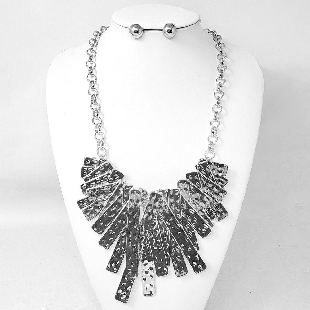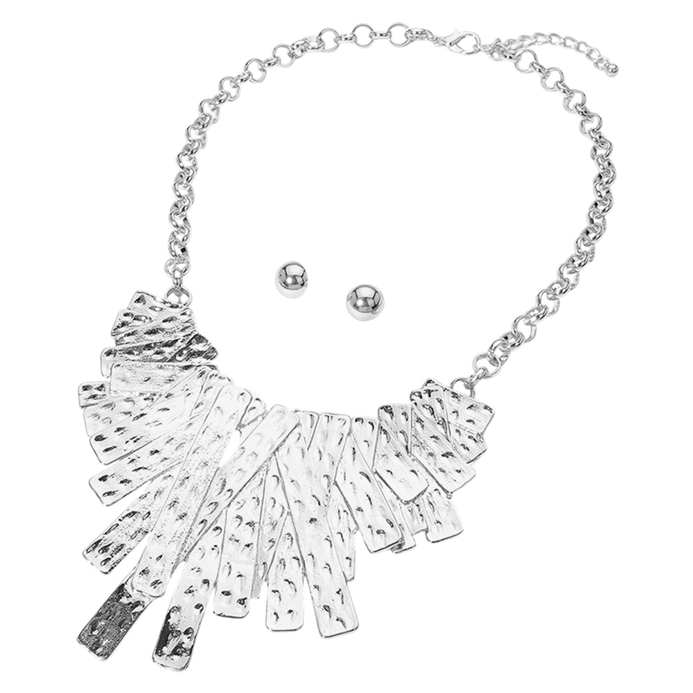 Details • Necklace Size : 26.5" + 3.25" L • Decor Size : 4.25" L • Earrings Size : 0.6" L • Elevate your look with this hammered metal statement necklace and matching stud earrings. Featuring textured fringe-style accents on a bold chain, this versatile set adds modern sophistication and shine. Perfect for special events or enhancing your everyday outfits. • Lead and Nickel Compliant