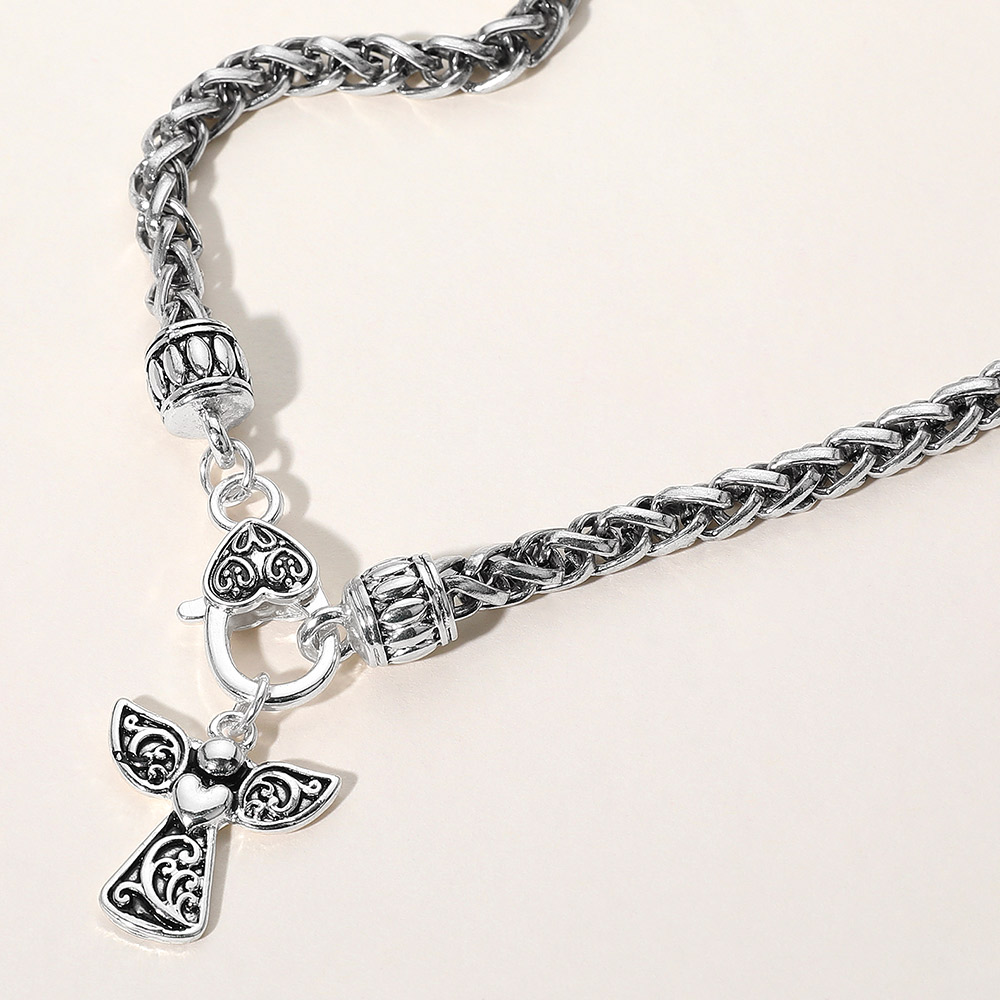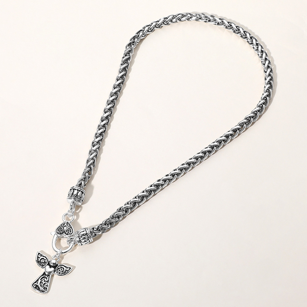 Details • Necklace Size : 16" L • Pendant Size : 0.9" X 1.1" • Elevate your look with this angel pendant chain necklace featuring intricate detailing and a bold woven chain design. Perfect as a meaningful accessory or statement piece, this necklace adds timeless charm and versatile style to both casual outfits and dressy ensembles. • Lead and Nickel Compliant