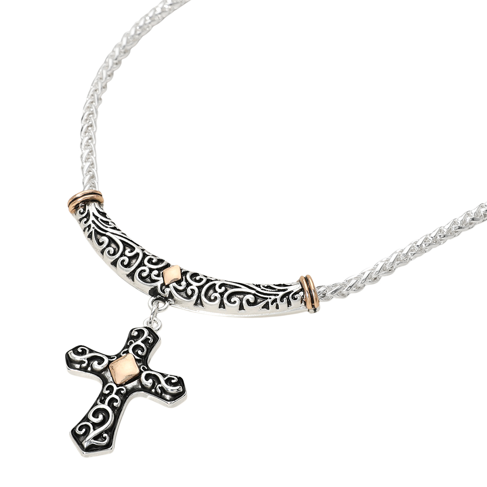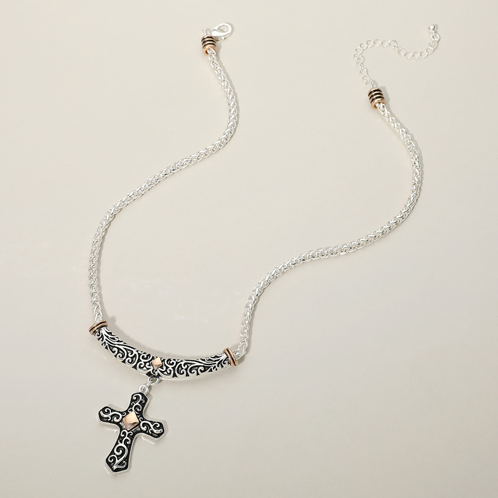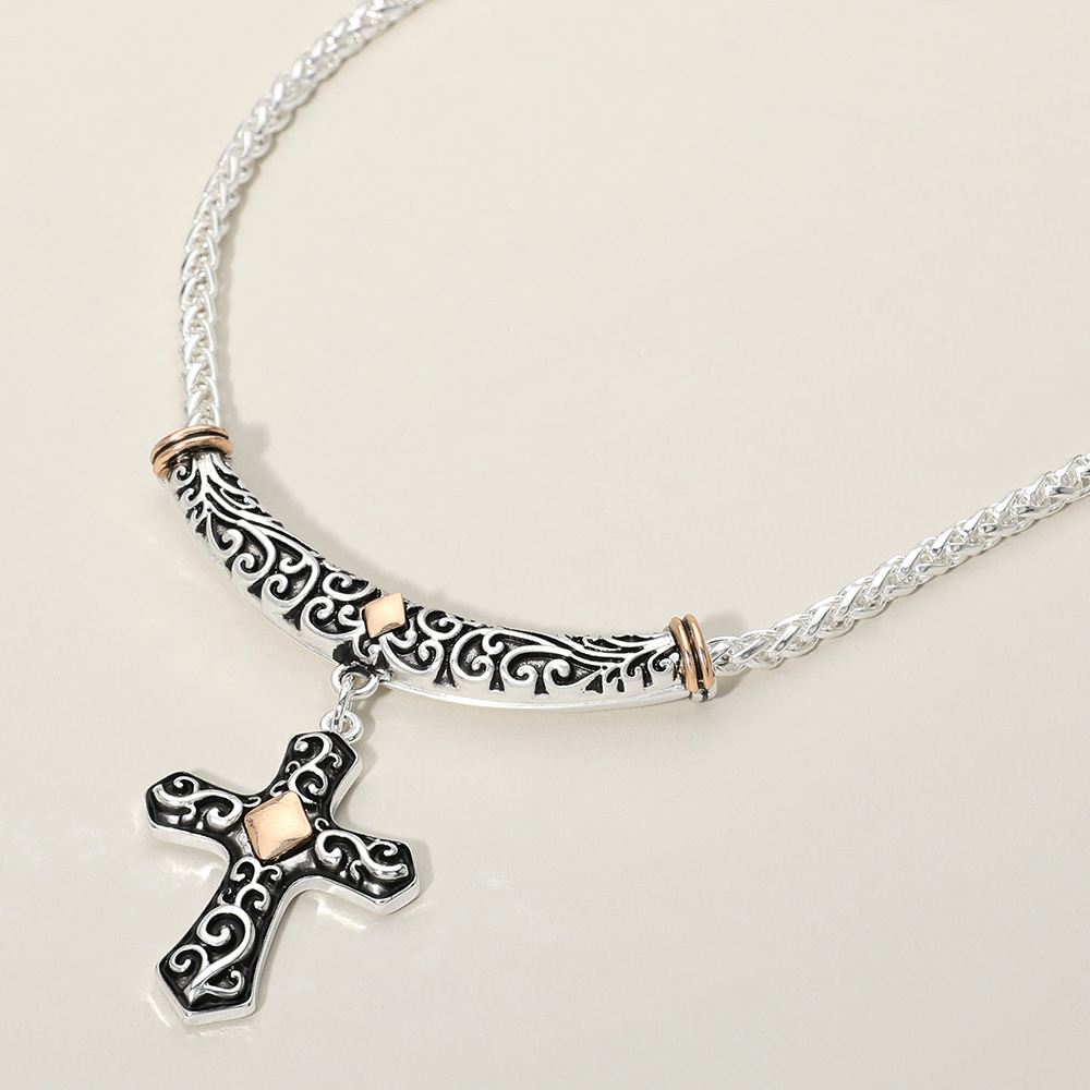 Details • Necklace Size : 18" + 3.25" L • Decor Size : 0.3" L • Pendant Size : 1.1" X 1.7" • Elegant necklace featuring a cross pendant suspended from a curved, swirl-engraved bar. A refined design perfect for everyday inspiration or special occasions with classic symbolic style. • Lead and Nickel Compliant