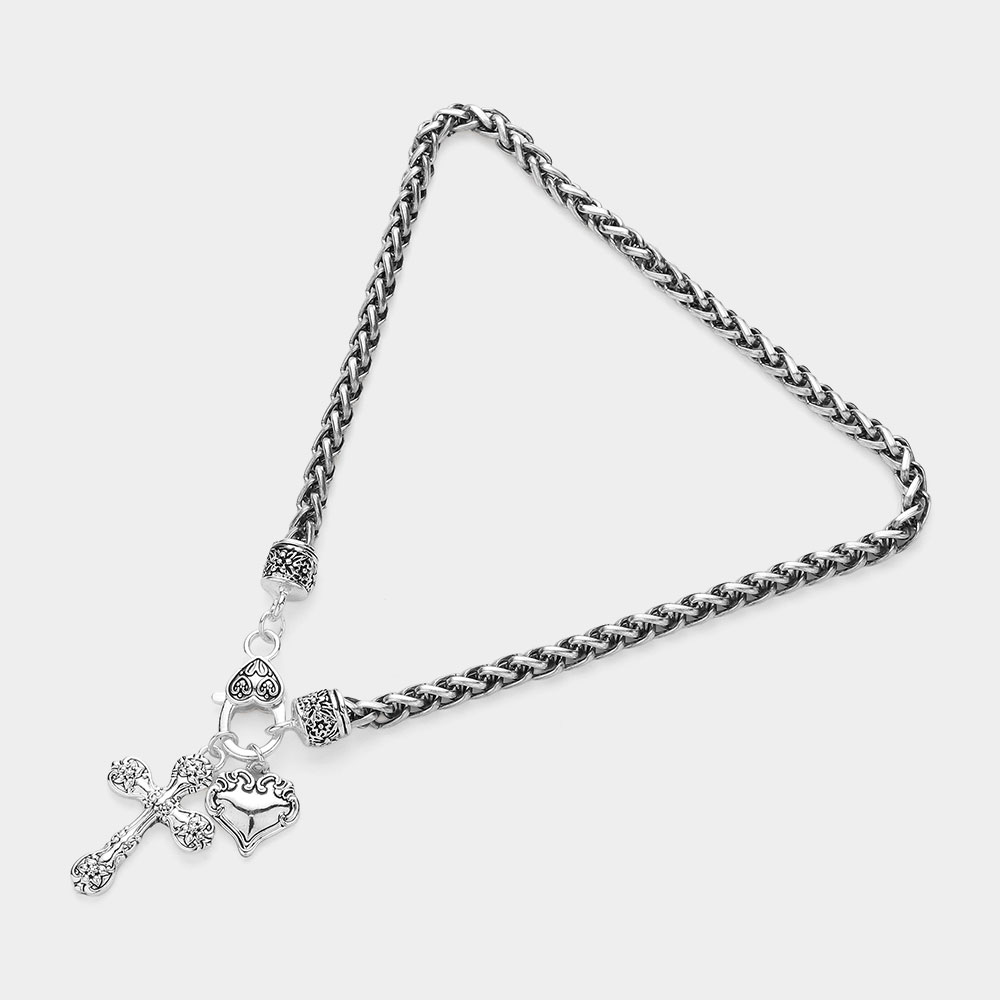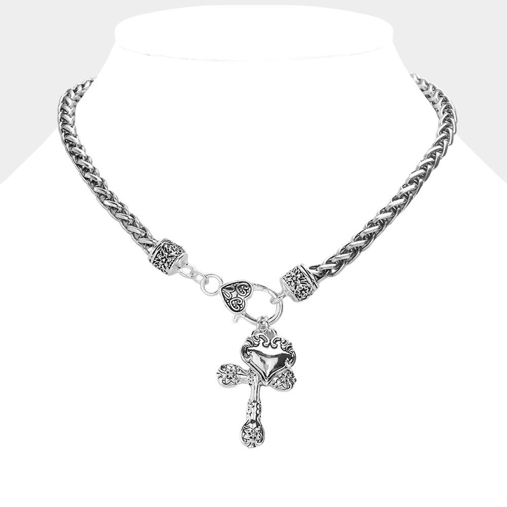 Antique Metal Heart Cross Pendant Necklace