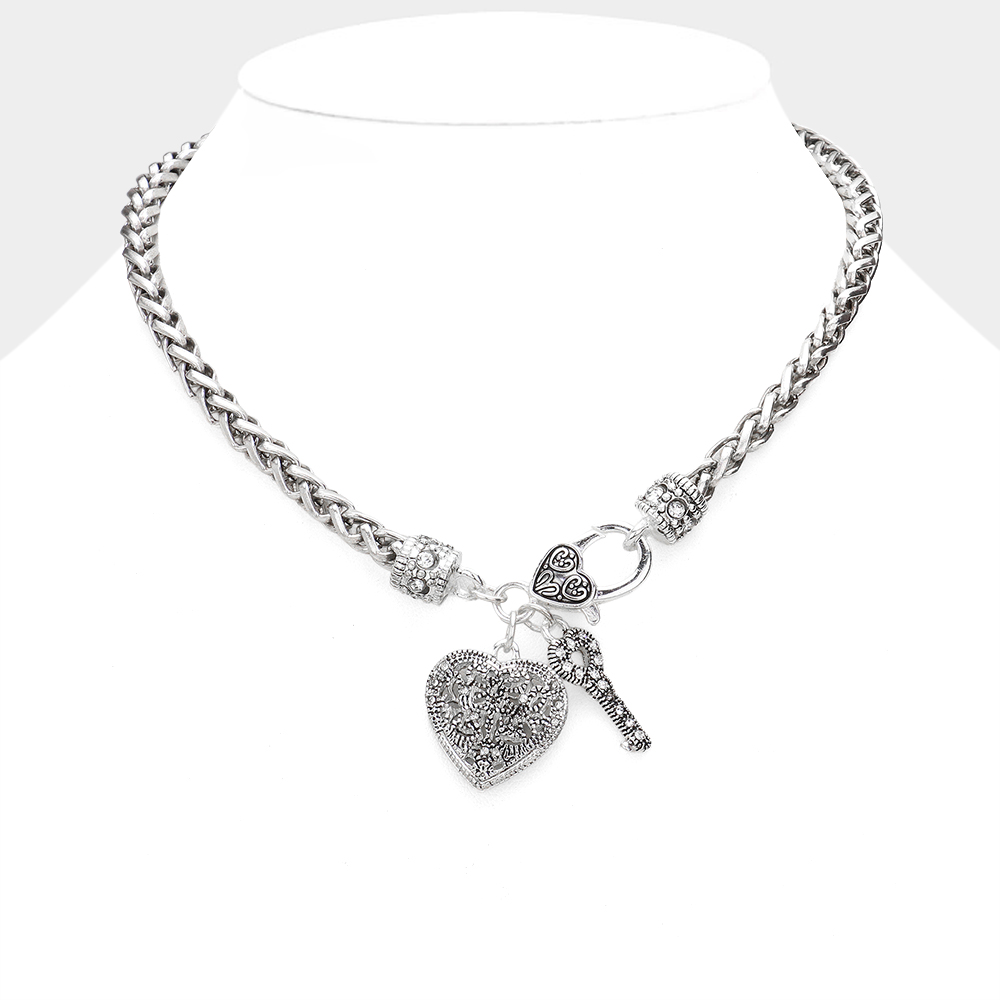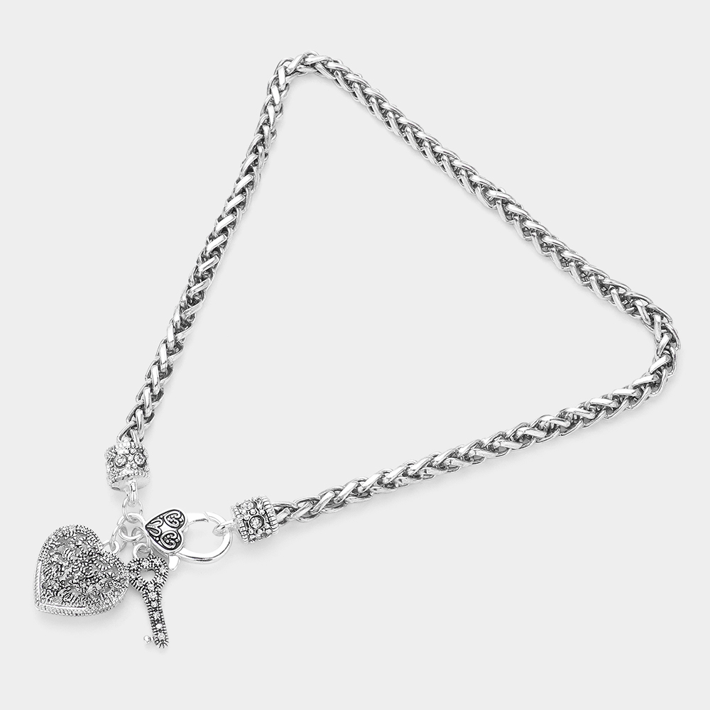 Antique Metal Heart Key Lock Pendant Toggle Necklace