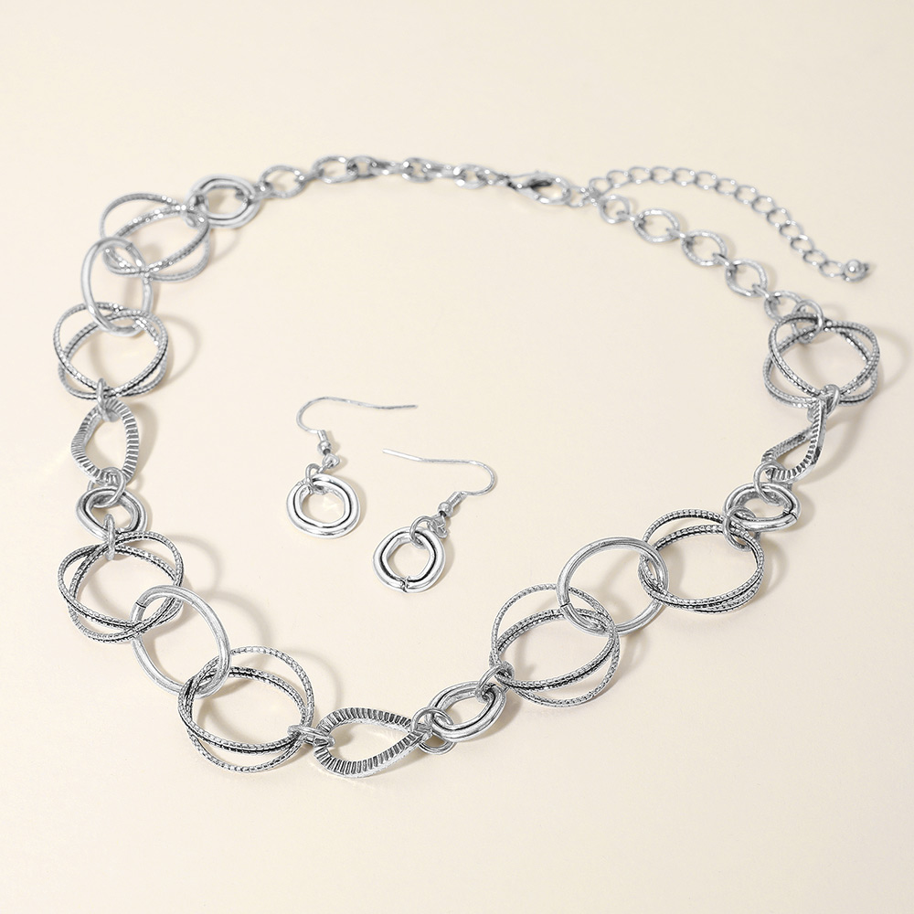 • This modern necklace and earring set showcases interlocking rings in varied shapes and textured finishes, creating a stylish, sculptural look. Designed to complement both casual and elevated outfits, it adds artistic detail and versatile elegance to any jewelry collection.