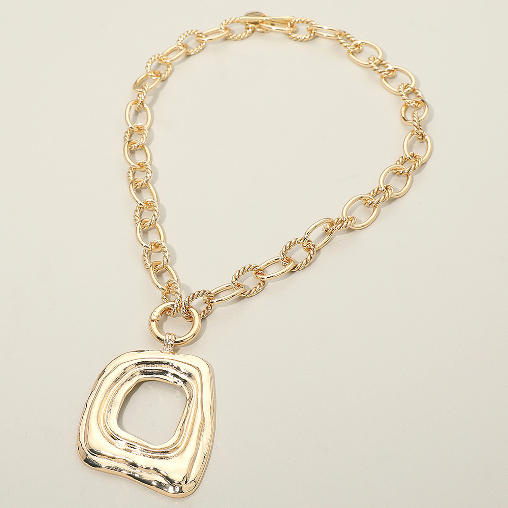 Details • Necklace Size : 18.5" + 0.5" L • Pendant Size : 1.8" X 2.8" • Elevate your outfit with this modern abstract link necklace featuring a bold textured pendant and statement chain. Its contemporary design brings a touch of sophistication and artistic flair, making it a versatile piece perfect for both casual and dressy occasions. • Lead and Nickel Compliant
