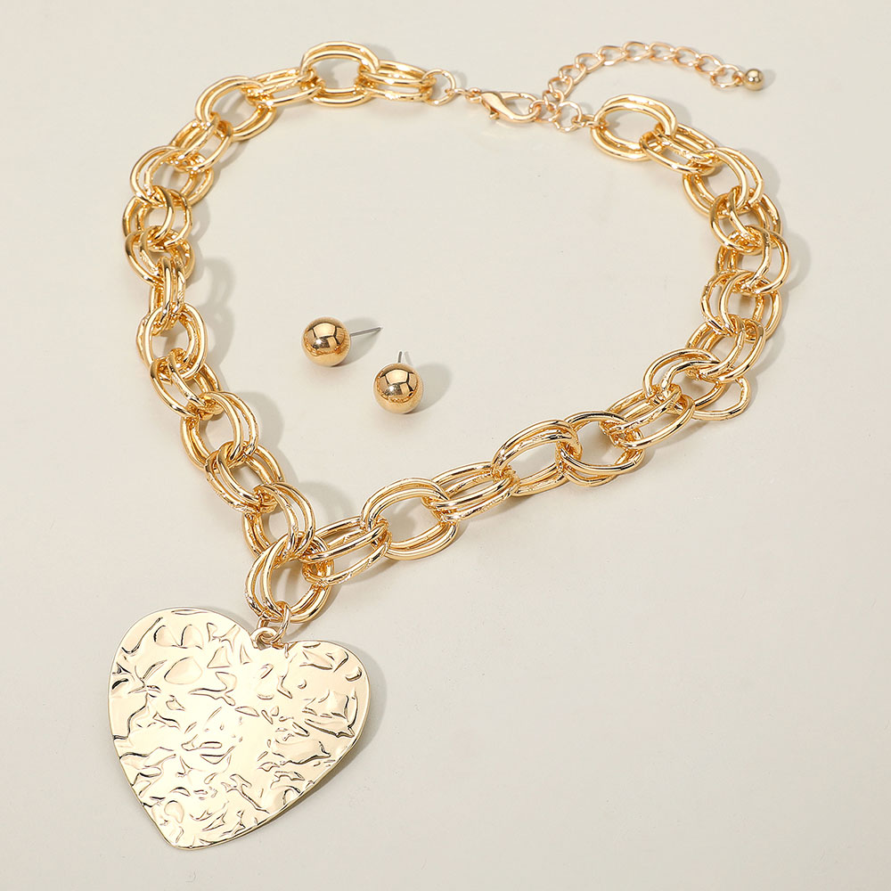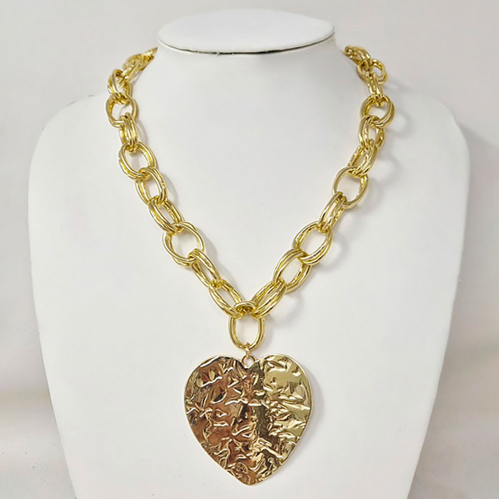 • Statement necklace and earring set featuring a bold chain design with a large hammered heart pendant. The matching stud earrings complete this elegant, modern look that blends romance with sophistication, perfect for dressing up any outfit with effortless style.