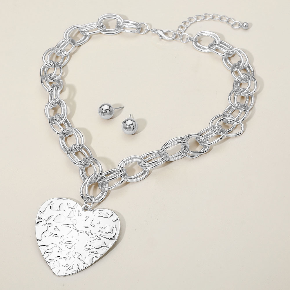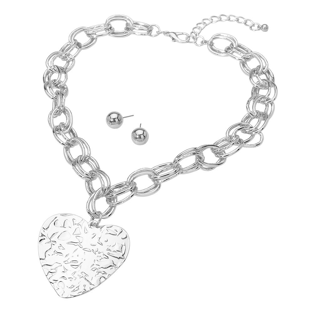 • Statement necklace and earring set featuring a bold chain design with a large hammered heart pendant. The matching stud earrings complete this elegant, modern look that blends romance with sophistication, perfect for dressing up any outfit with effortless style.