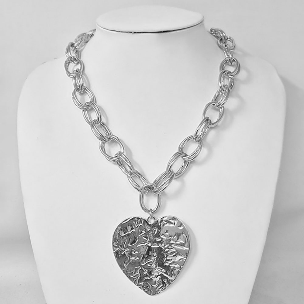 Bold Hammered Metal Heart Pendant Chunky Chain Statement Necklace