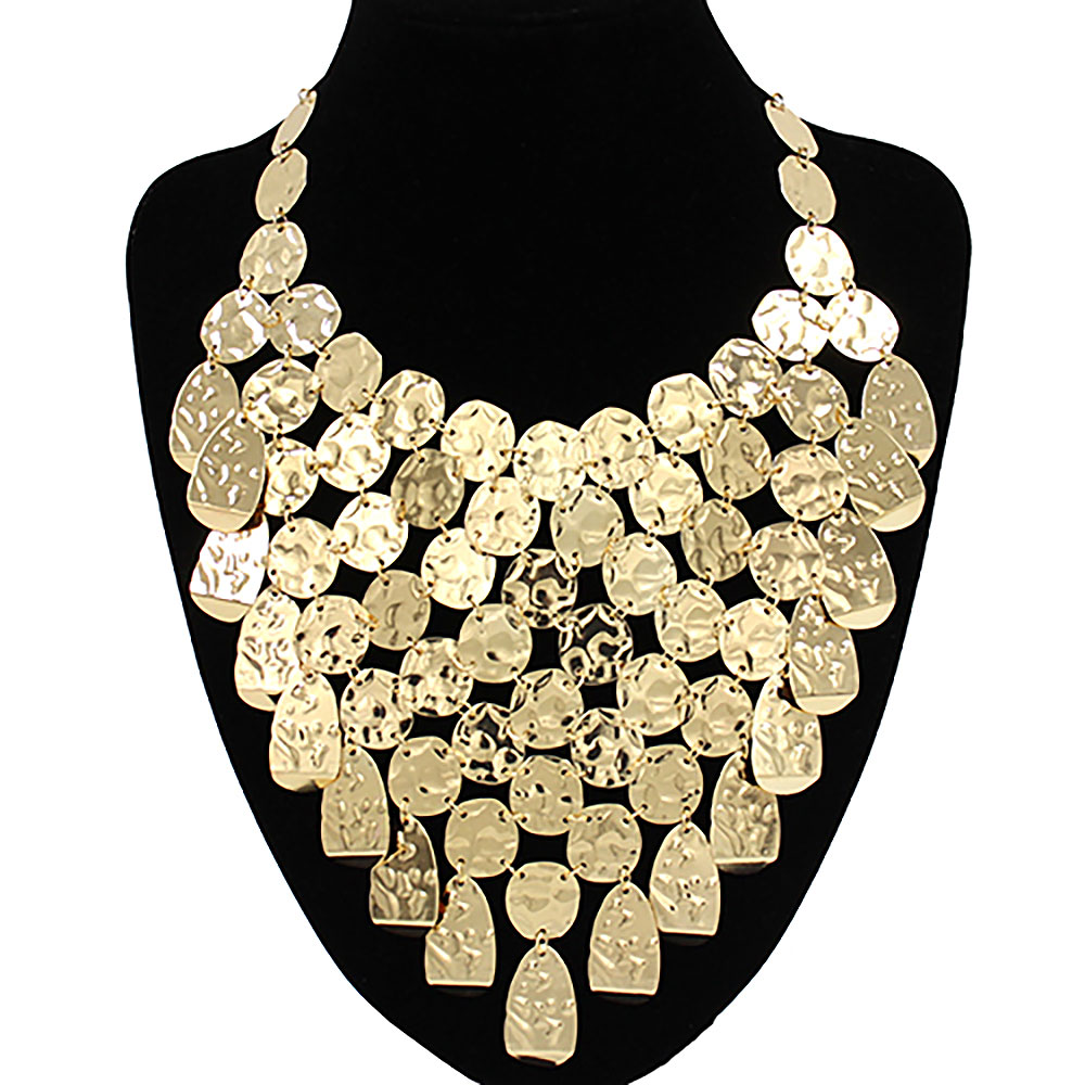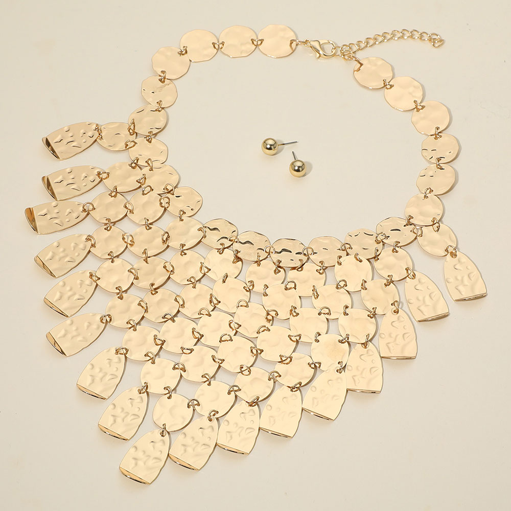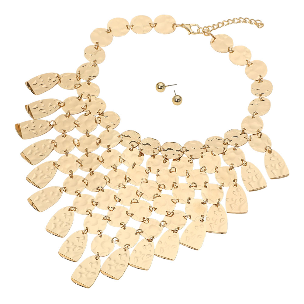 Details • Necklace Size : 16" + 3" L • Decor Size : 5.5" L • Earrings Size : 0.3" L • Turn heads with this bold layered statement necklace set, featuring cascading hammered discs and drop plates for a dramatic, eye-catching look. Complete with matching stud earrings, it’s the perfect accessory to elevate evening wear or add flair to casual outfits. • Lead and Nickel Compliant