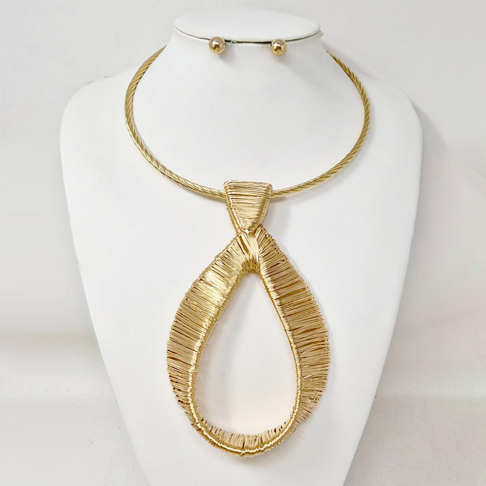 Bold Metal Wire Wrapped Teardrop Pendant Statement Necklace