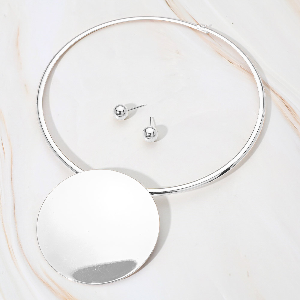 • Make a bold statement with this modern round pendant necklace and matching stud earring set. The sleek, minimalist design and polished finish create a striking contemporary look. Perfect for adding effortless sophistication and artistic flair to any outfit or occasion.