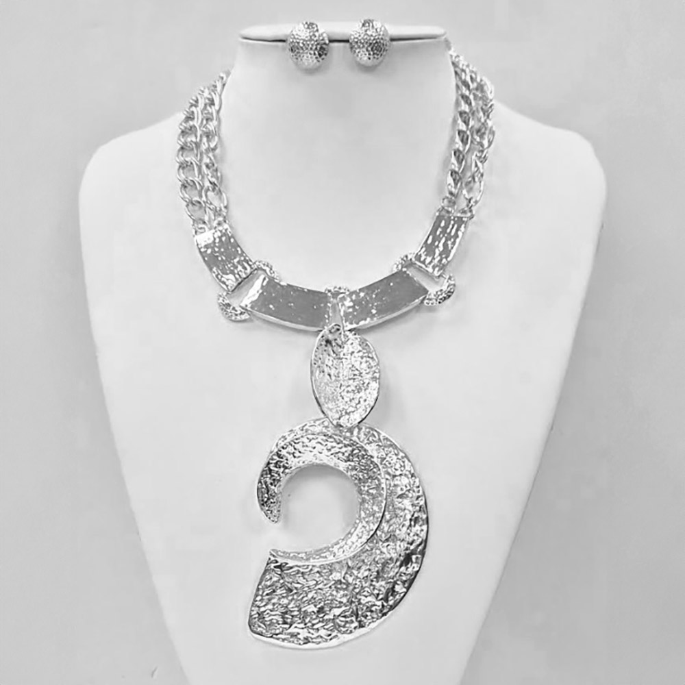 • This textured crescent statement necklace set combines bold design with refined artistry. The sculpted crescent pendant, paired with matching stud earrings, creates an eye-catching centerpiece that enhances both modern and elegant outfits with a touch of distinctive sophistication.