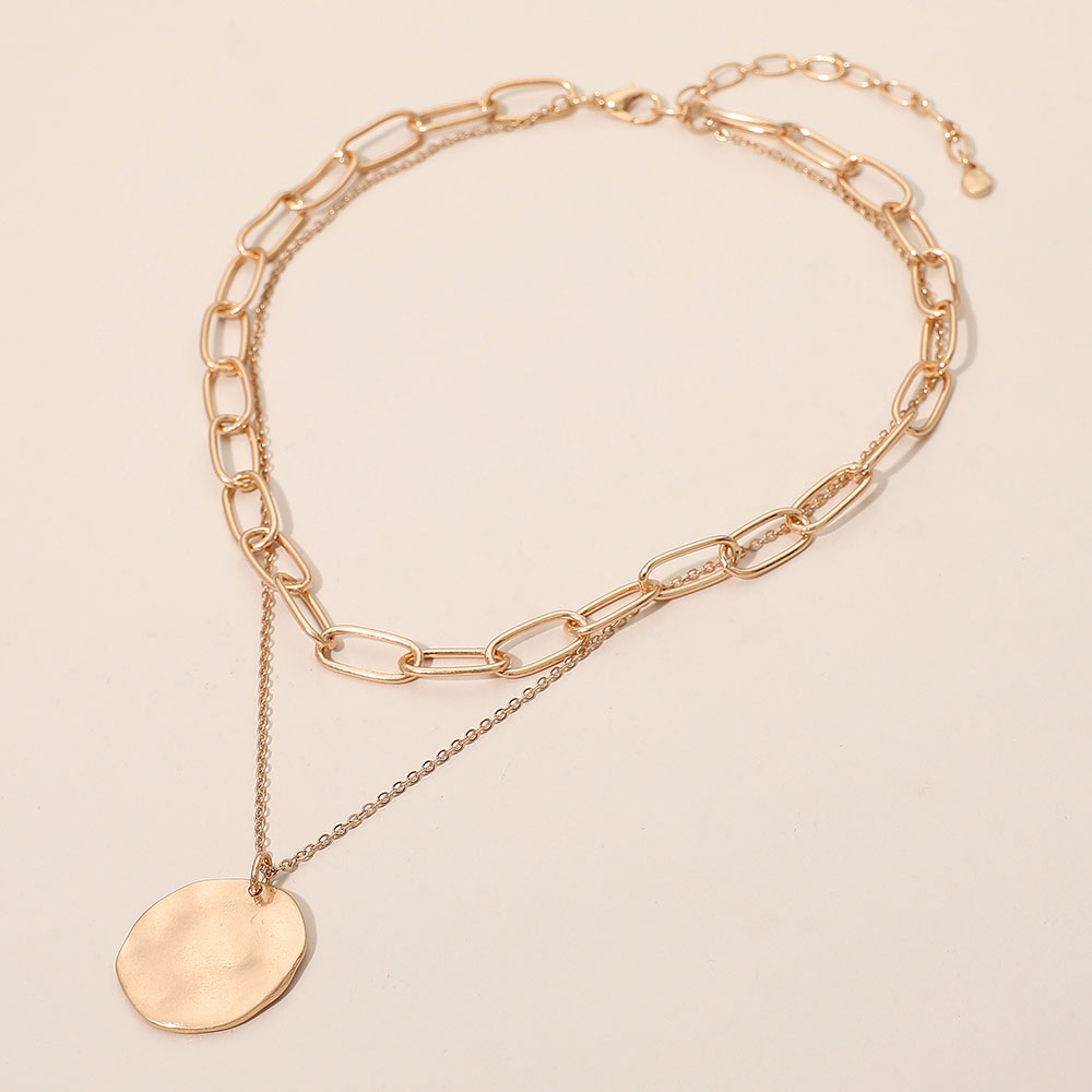 Brushed Hammered Metal Round Pendant Paperclip Chain Layered Necklace