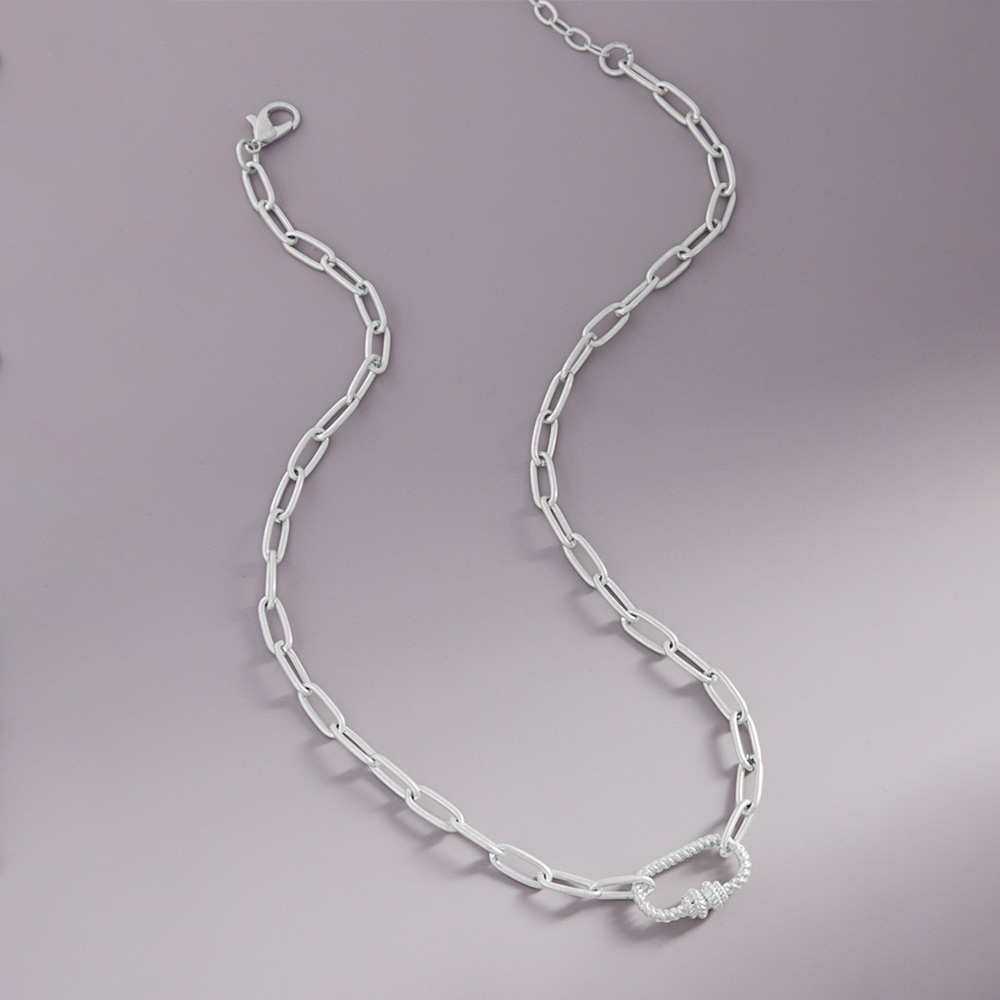 Details • Necklace Size : 18.5" + 3.5" L • Pendant Size : 0.5" X 0.8" • Make a chic statement with this paperclip chain necklace featuring a textured oval link centerpiece. Modern and versatile, it’s a stylish accessory that pairs effortlessly with layered looks or stands out beautifully on its own. • Lead and Nickel Compliant