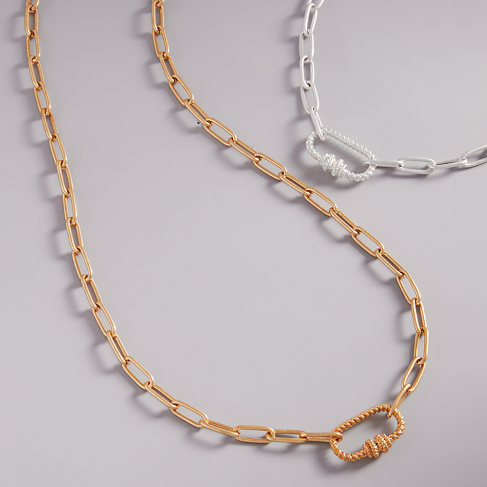 Brushed Metal Rope Carabiner Shaped Pendant Pointed Paperclip Chain Necklace