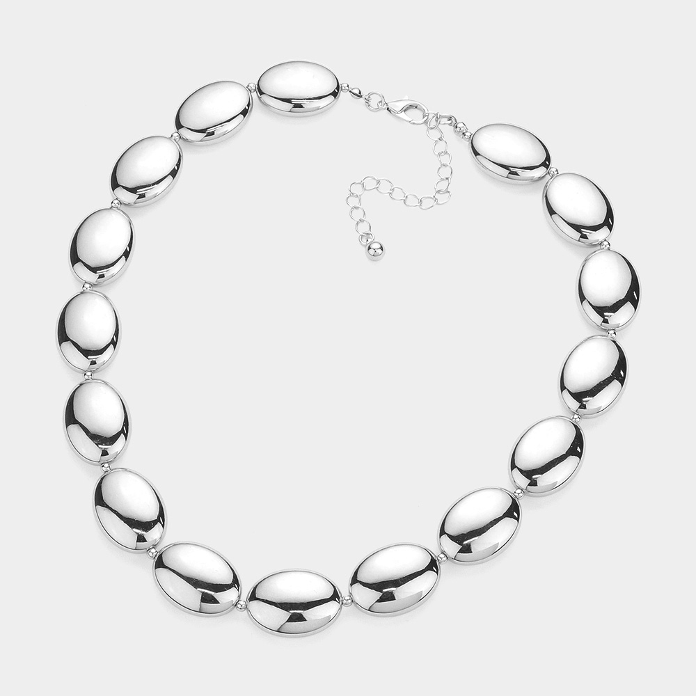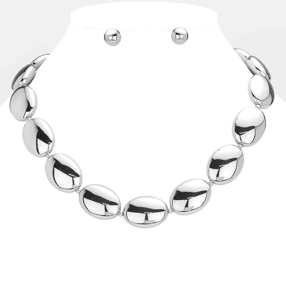• This bold oval link necklace set features smooth, high-gloss pieces for a sleek, polished look. Designed to make a statement, the matching stud earrings complete the ensemble with effortless elegance. Perfect for formal occasions or elevating your everyday style.