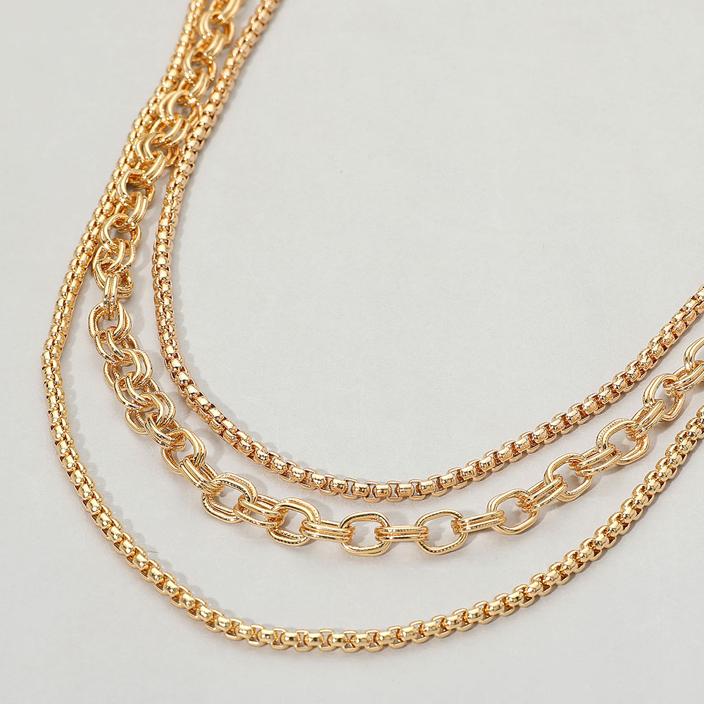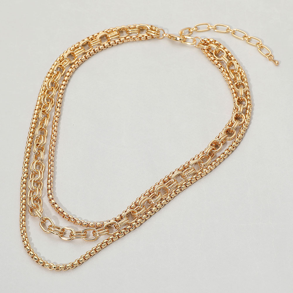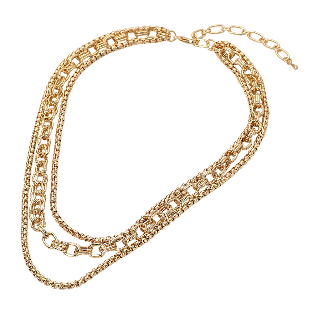Details • Necklace Size : 15" + 3" L • Decor Size : 2" L • Add a bold accent to any outfit with this multi-strand layered chain link necklace. Designed with varied link styles for a dynamic look, it's a versatile piece for statement layering or standalone elegance. • Lead and Nickel Compliant