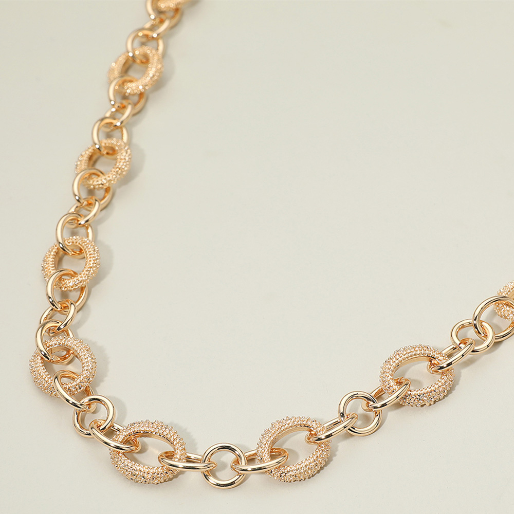 Details • Necklace Size : 16.5" + 3.5" L • Decor Size : 0.6" L • Elevate your look with this textured link chain necklace featuring alternating smooth and detailed circular links. A bold yet versatile statement piece, perfect for layering or wearing solo. Designed for modern style and timeless appeal, this chain necklace adds sophistication to any outfit. • Lead and Nickel Compliant